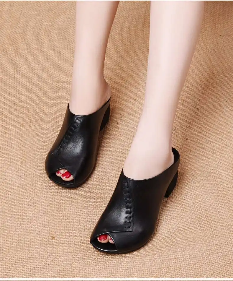 Мягкие кожаные шлепанцы на толстом каблуке, удобные универсальные женские сандалии на среднем каблуке с открытым носком, женская обувь для матери