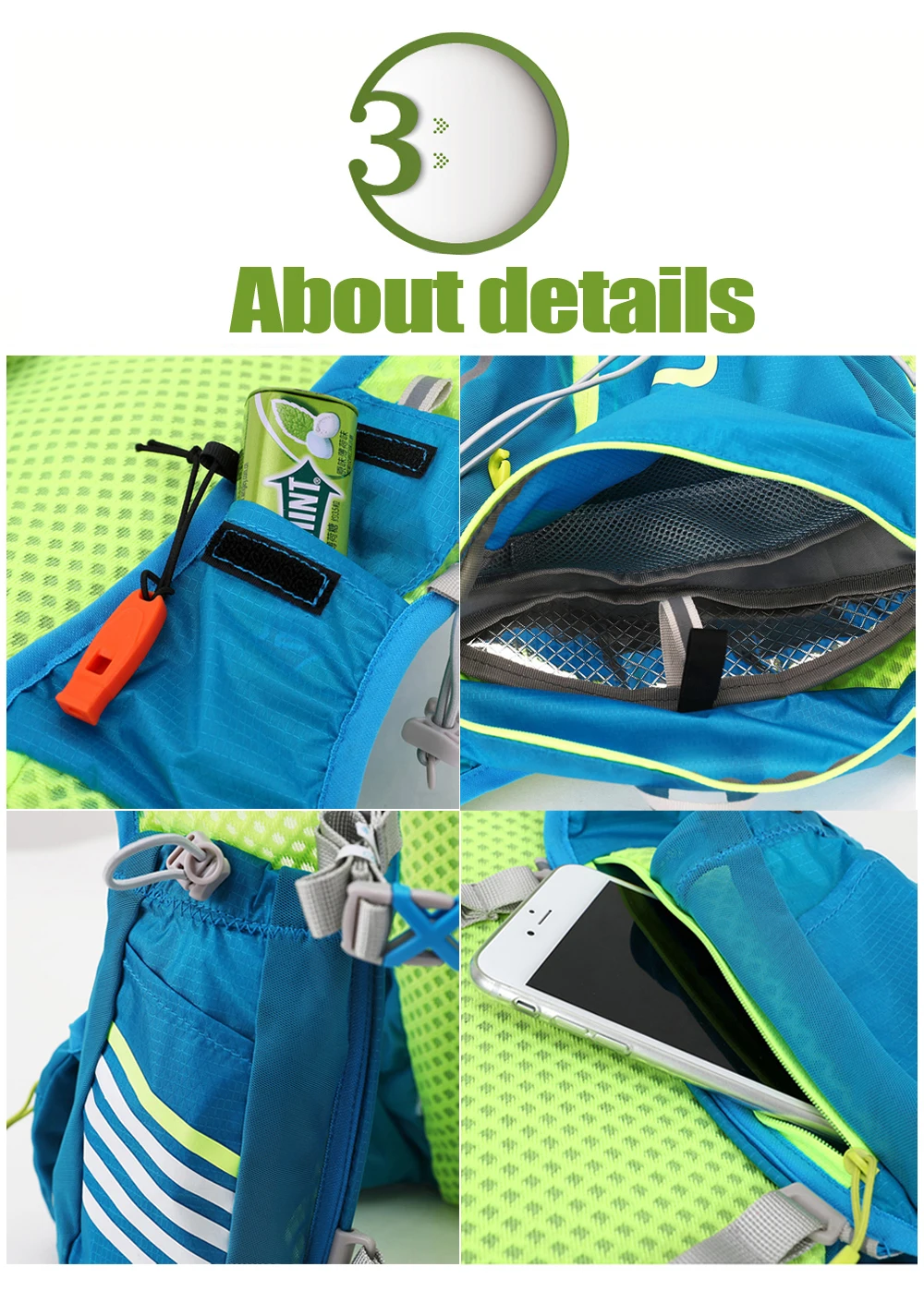 Поставляется с выдвижным поясным ремнем и регулируемым нагрудным ремнем сетчатой конструкции, дышащая и тепловыделяющая новая конструкция с несколькими отделениями, для бега на большие расстояния и бега по пересеченной местности требуется высокоэластичная веревка для увеличения грузоподъемности, может использоваться для переноски палки для скалолазания. Высококачественная Пряжка и молния, прочная и долговечная