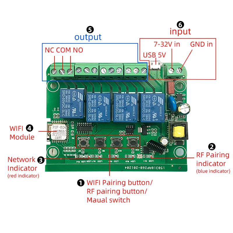 1.WFI Кнопка сопряжения/RF433 Кнопка сопряжения/Maual переключатель2. Индикатор сопряжения RF (синий индикатор)3. Сетевой индикатор (красный индикатор)4. Модуль WFI5. Нет, NC,COM выход6. Вход: 7-32 в винтовой клеммный порт или порт USB 5 В
