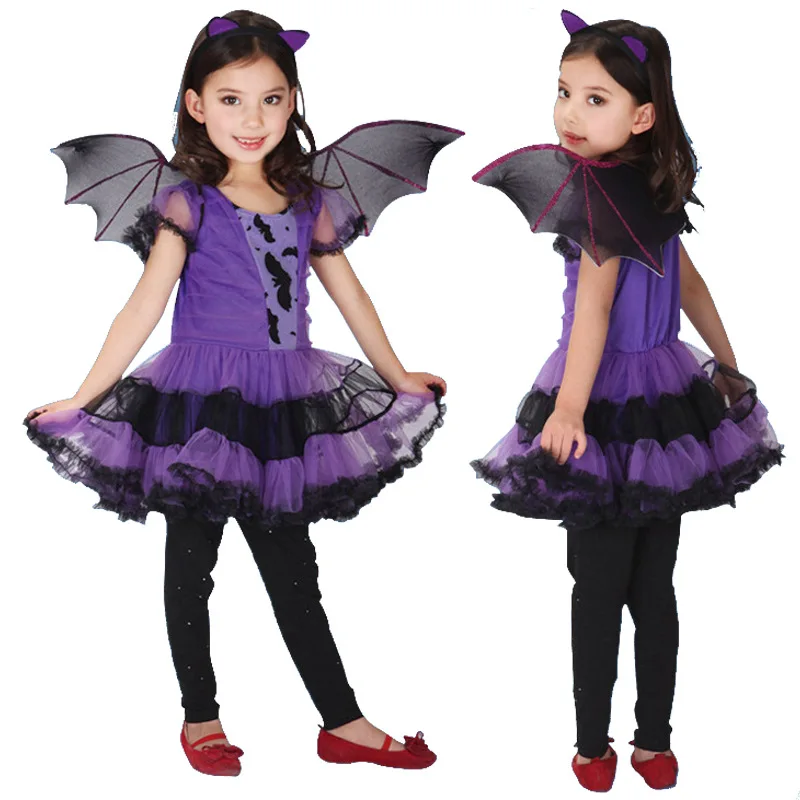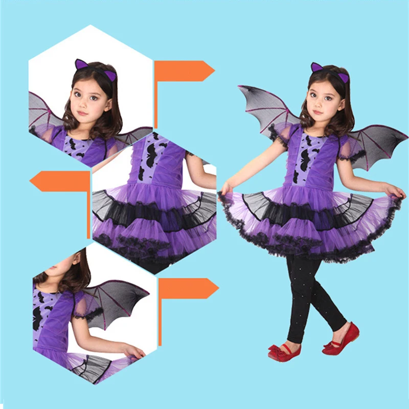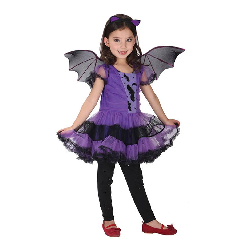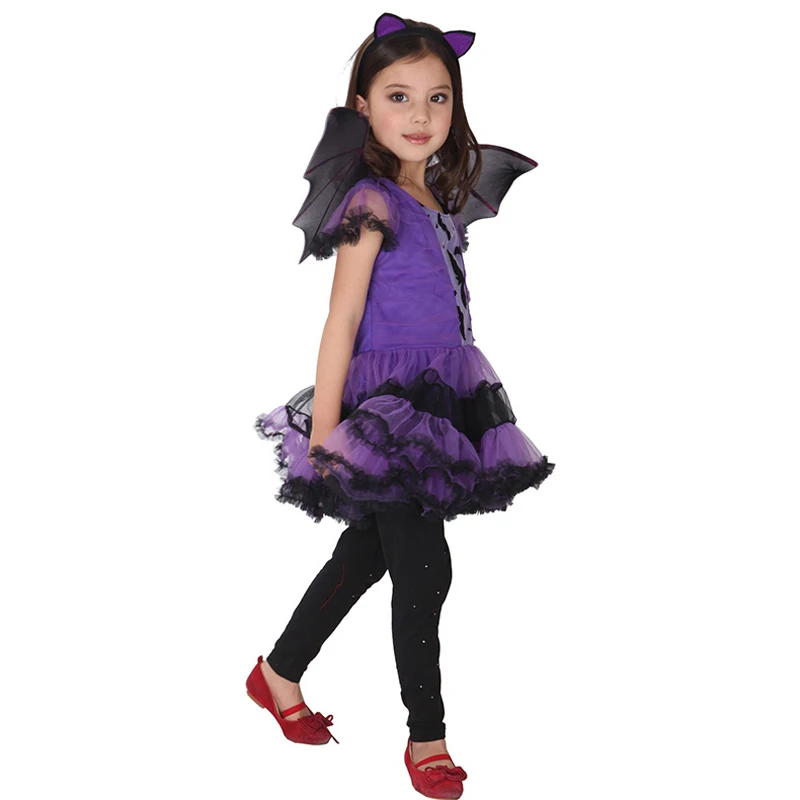 Костюмы для косплея на Хэллоуин для девочек, фиолетовая одежда Летучая мышь с крыльями, головной убор, детские платья-пачки для маскарада и карнавала