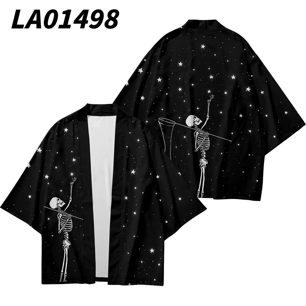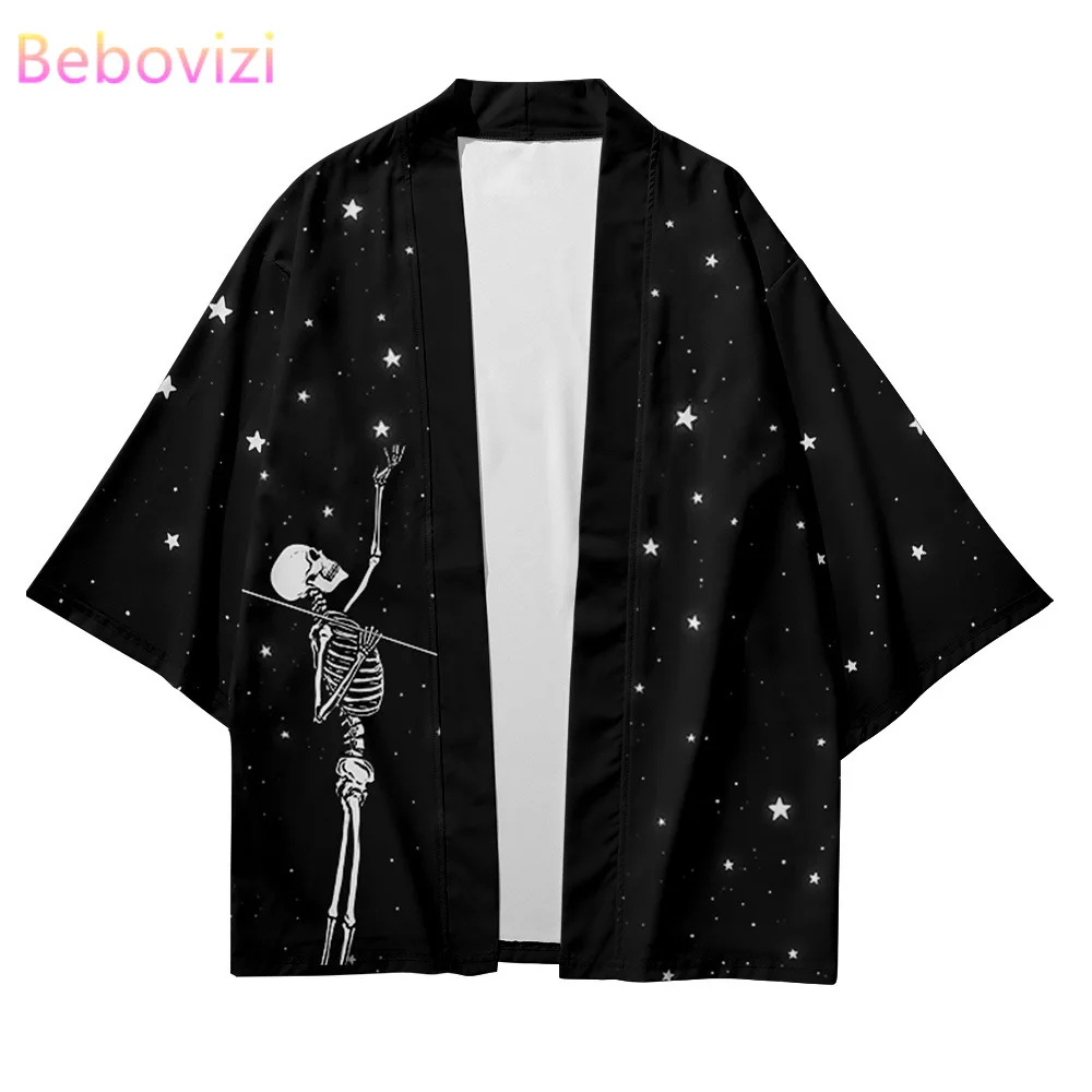 Кимоно для мужчин и женщин с принтом скелета, Свободный кардиган в японском стиле, хаори в стиле Харадзюку, верхняя одежда для косплея, юката, черный цвет, размера плюс