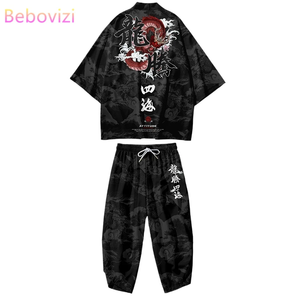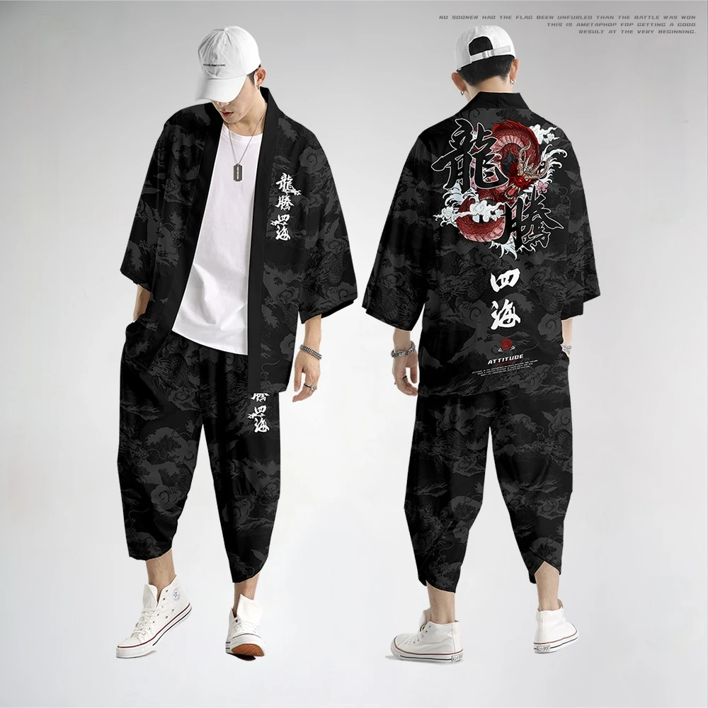 Костюм-двойка женскиймужской, Свободный кардиган в японском стиле, юката, кимоно и брюки в стиле Харадзюку, размеры 5XL4XL