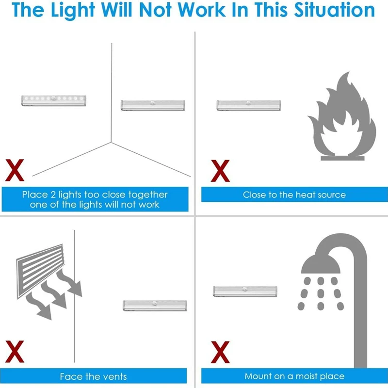 Этот светильник можно включить только в темноте. Он не включится если светильник датчик было обнаружено при достаточно светильник. И пожалуйста, не устанавливайте этот светильник в месте высокой температуры, в противном случае высокие температуры повлияют на клейкую ленту, и тогда светильник легко сползет.