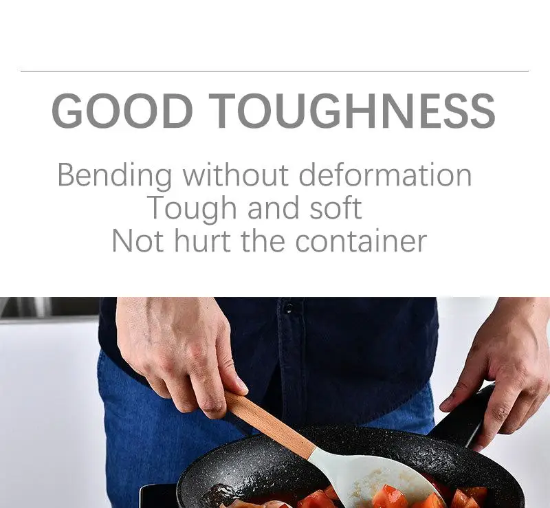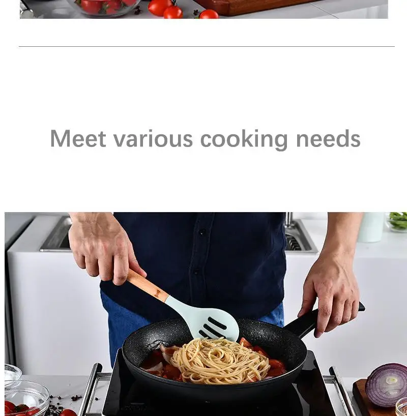 1. Изготовлен из силикона, высокой прочности и коррозионной стойкости, длительный срок службы. 2. Экологически чистый, устойчивый к воздействию-40 C -230 C, антипригарная сковорода, легко моется. Защита от пятен и запаха, легкая чистка в посудомоечной машине или за ее пределами 3. Подходит: микроволновая печь, тостер, пароварка, можно варить и стерилизовать. 4. Материал: силикон + Натуральное дерево акации использование высококачественного пищевого силикона, экологически чистый и прочный