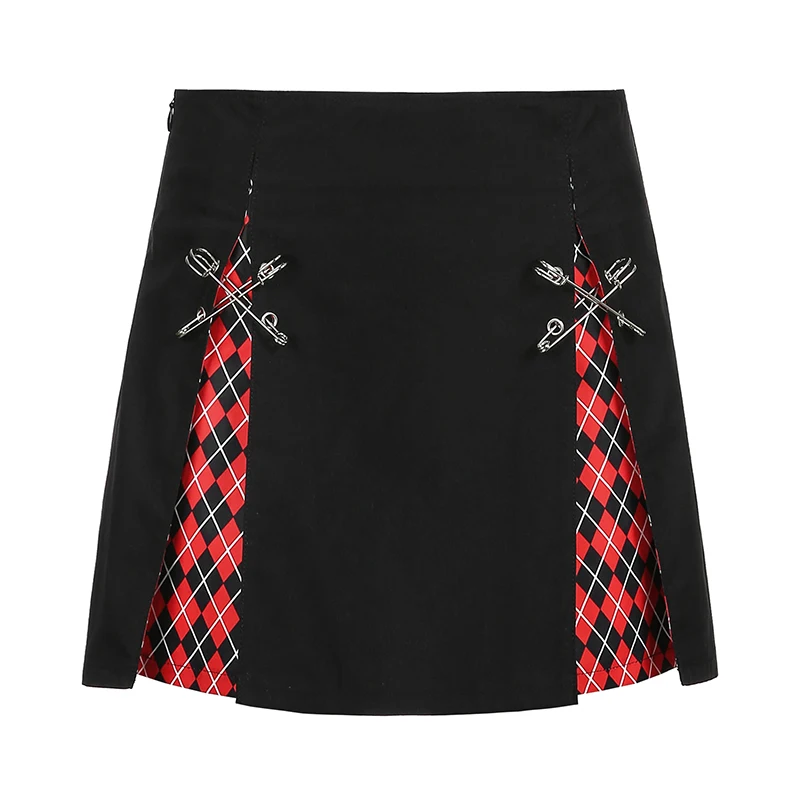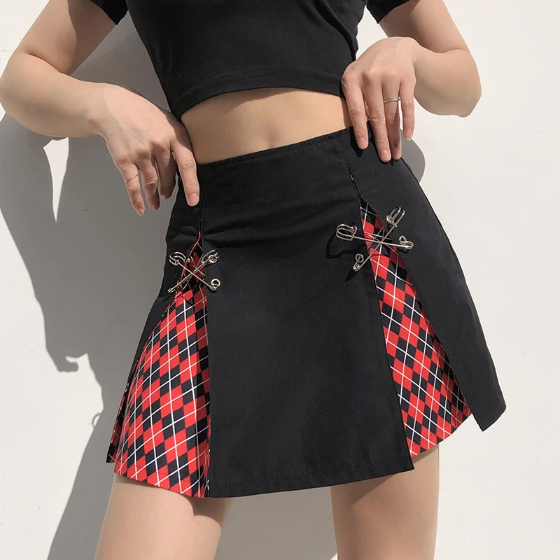 Женская клетчатая мини-юбка Goth Dark, винтажная черная трапециевидная юбка с высокой талией, в стиле Харадзюку, сексуальная готическая юбка в стиле пэчворк,