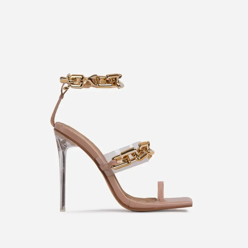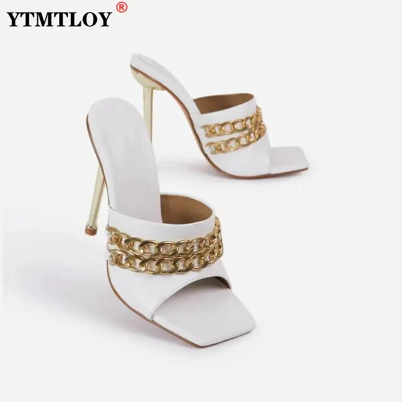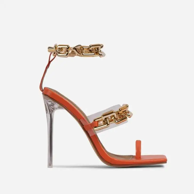 Сандалии женские с открытым носком, модные пикантные босоножки на металлической цепочке, туфли с кристаллами на тонком каблуке, повседневные туфли с открытым носком, высокие, черные, белые, оранжевые