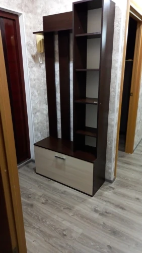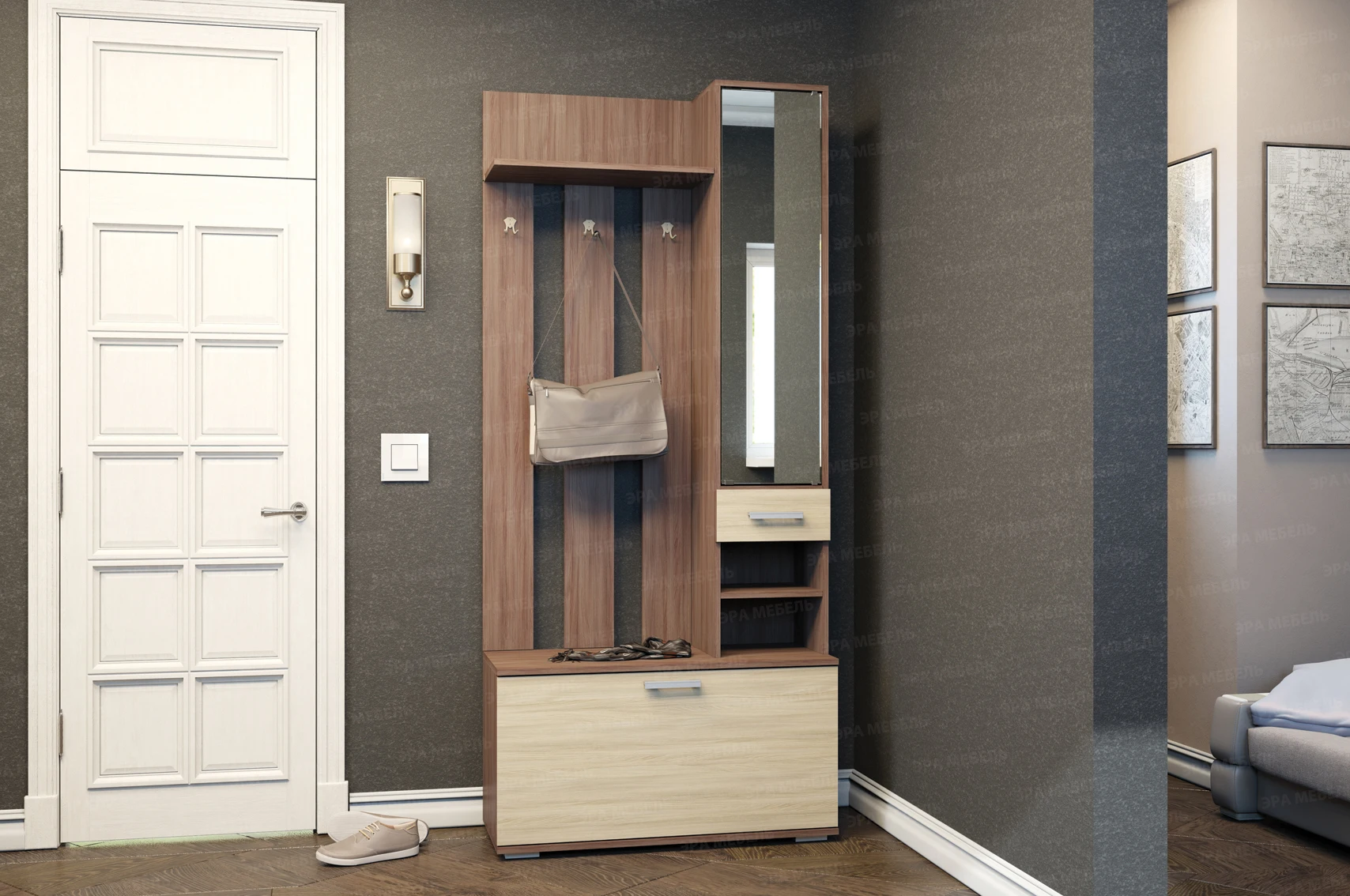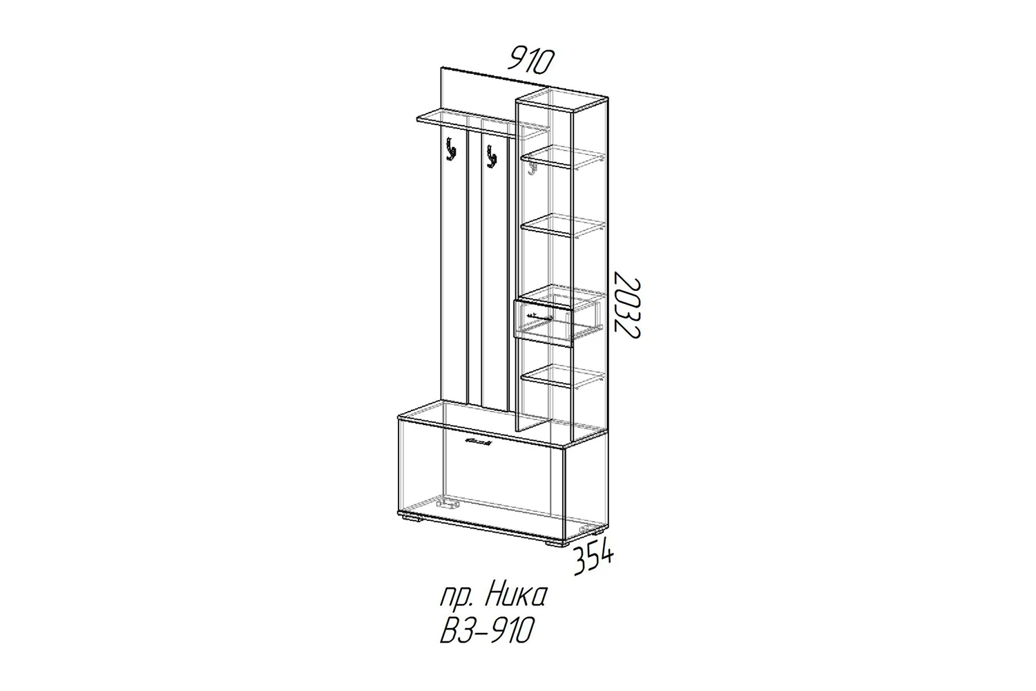 Имеет полку под головные уборы и три двухрожковых крючка для одежды, шкафчик с полками и зеркалом на дверце, небольшой выдвижной ящик и открытые ниши под ним и большой ящик за откидывающейся дверцей снизу.
