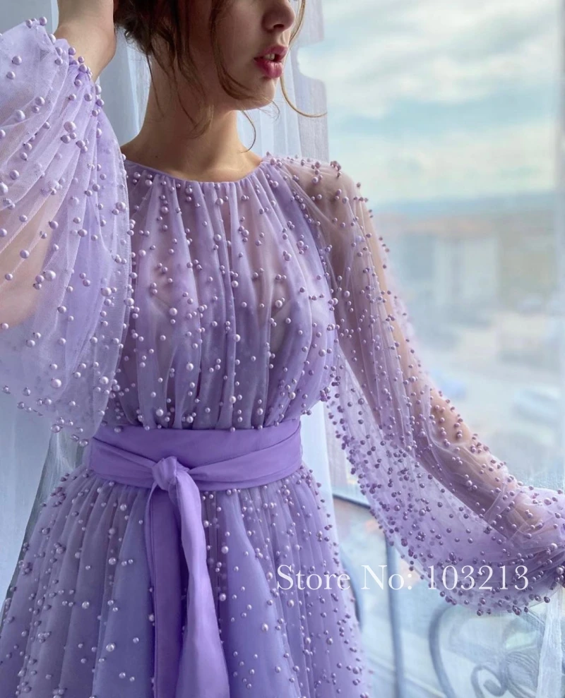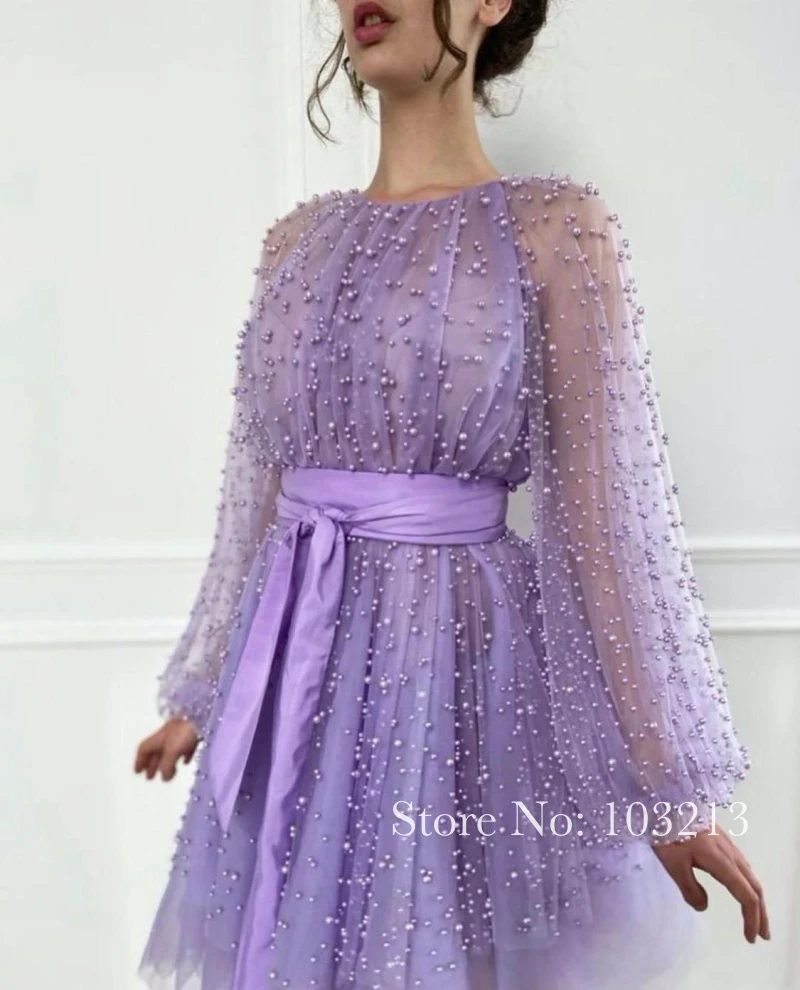 Роскошные короткие фиолетовые платья для выпускного с жемчугом тюлевые вечерние платья трапециевидной формы вечернее платье из атласа с длинным рукавом и поясом, вечерние платья для девочек