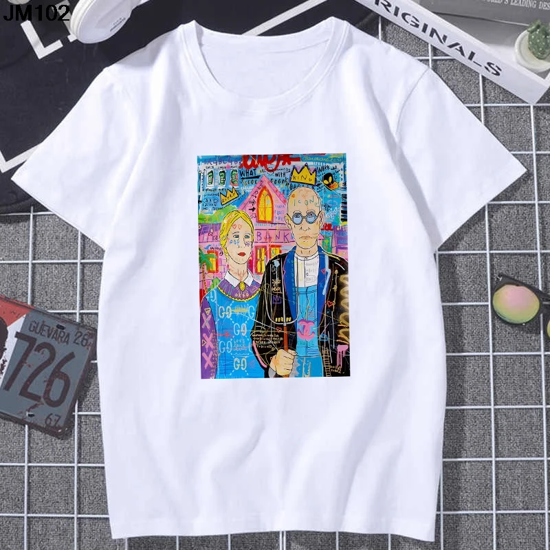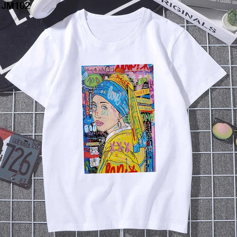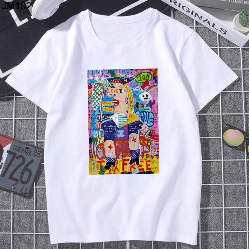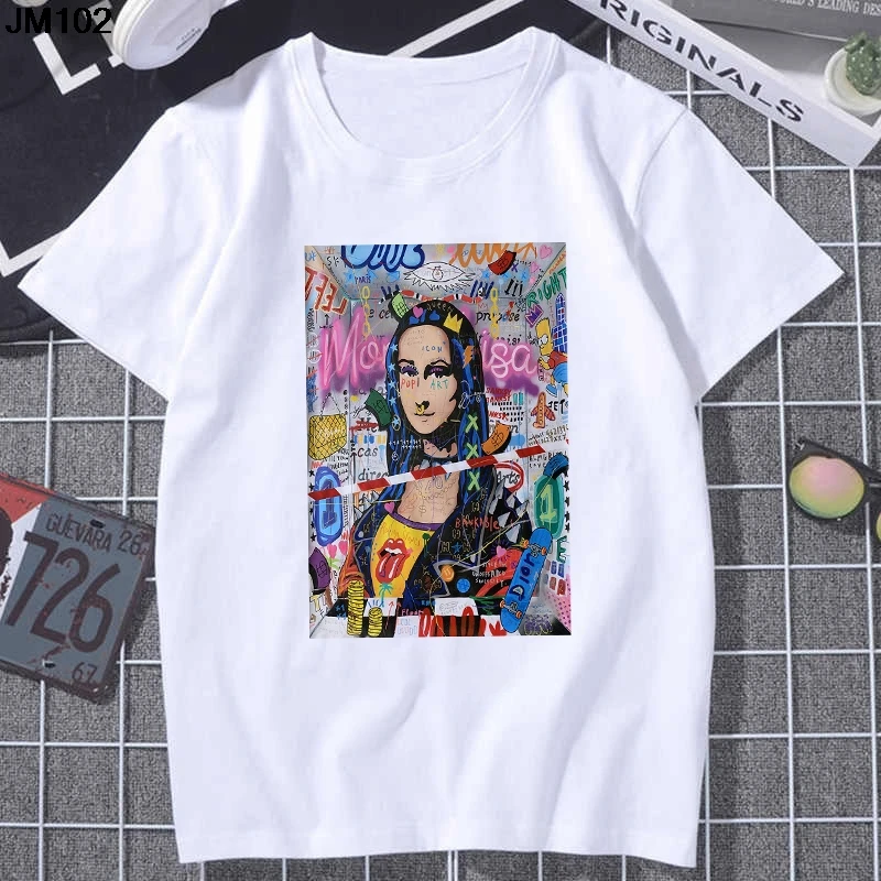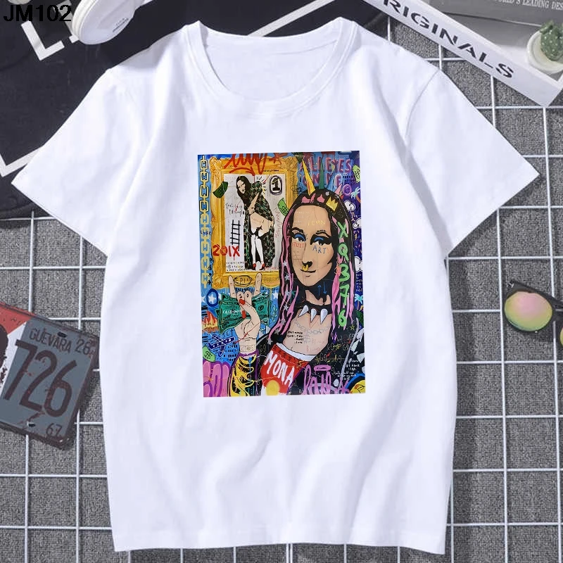 Женская футболка в стиле Харадзюку, белая футболка с забавным художественным принтом Моны Лизы и граффити, модная уличная одежда на лето