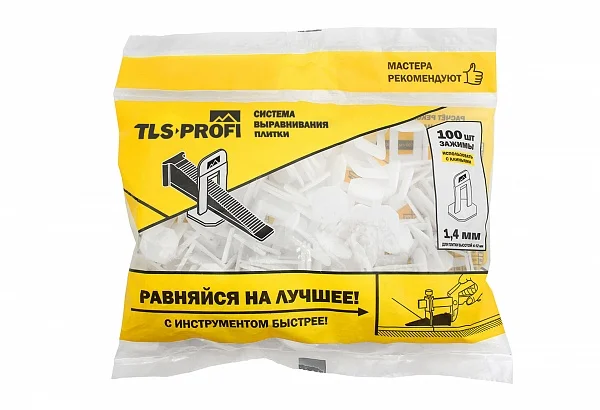 Зажимы для выравнивания плитки TLS-Profi - 1,4 мм. С помощью них можно получить швы, подходящие для укладки на теплый пол.- Не ломаются при установке и легко сбиваются при помощи киянки.- Тонкая опора 1.8 мм - меньше расход клея.- Возможность укладки на стене.