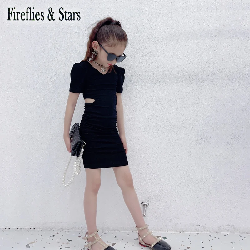 Имя:Летнее платье для девочек, платье-футболка, детская длинная футболка, детская одежда, модное облегающее плиссированное платье с пышными рукавами и вырезами сбоку на возраст от 4 до 13 лет