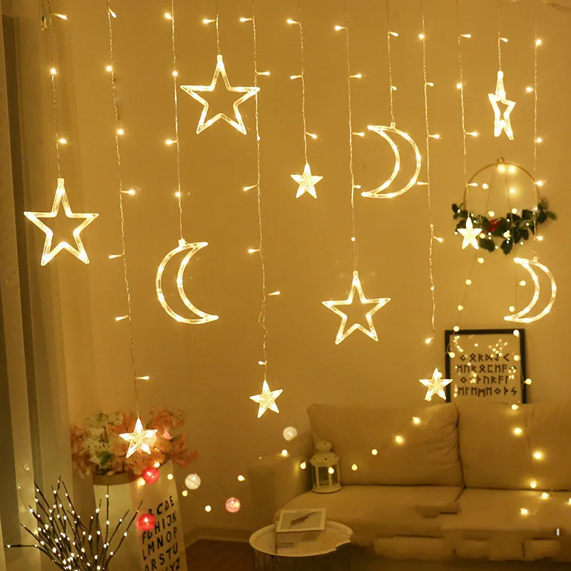 СВЕТОДИОДНАЯ Гирлянда-сосулька со звездами и луной, гирлянда-занаве...