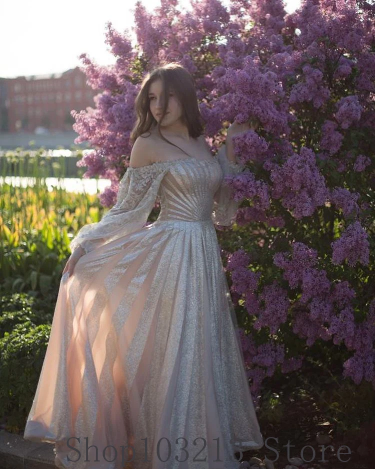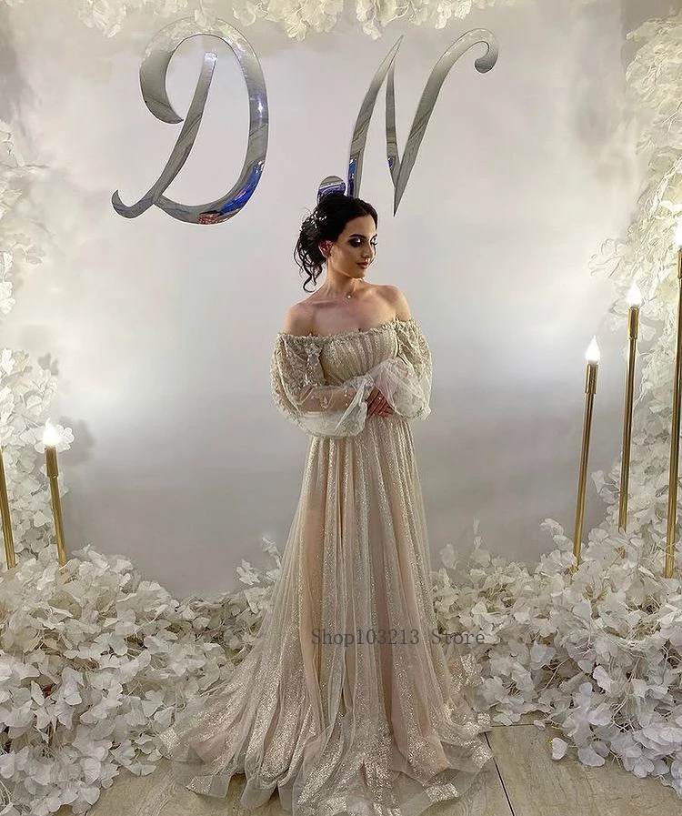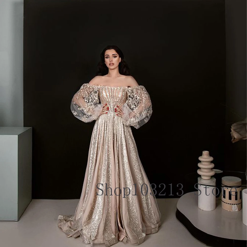Женское вечернее платье цвета шампанского, с открытыми плечами, с длинными рукавами, до пола, с бисером, трапециевидного силуэта, для выпускного, потрясающий с блестками
