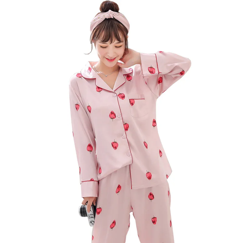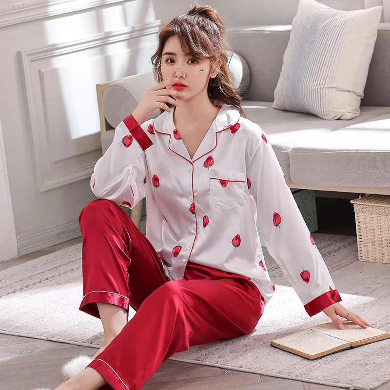 Атласный пижамный комплект на пуговицах в виде клубники, Пижама, рубашка, пижама, длинная Корейская одежда с принтом фруктов, шелковая пижама, ночная рубашка, пижамный комплект