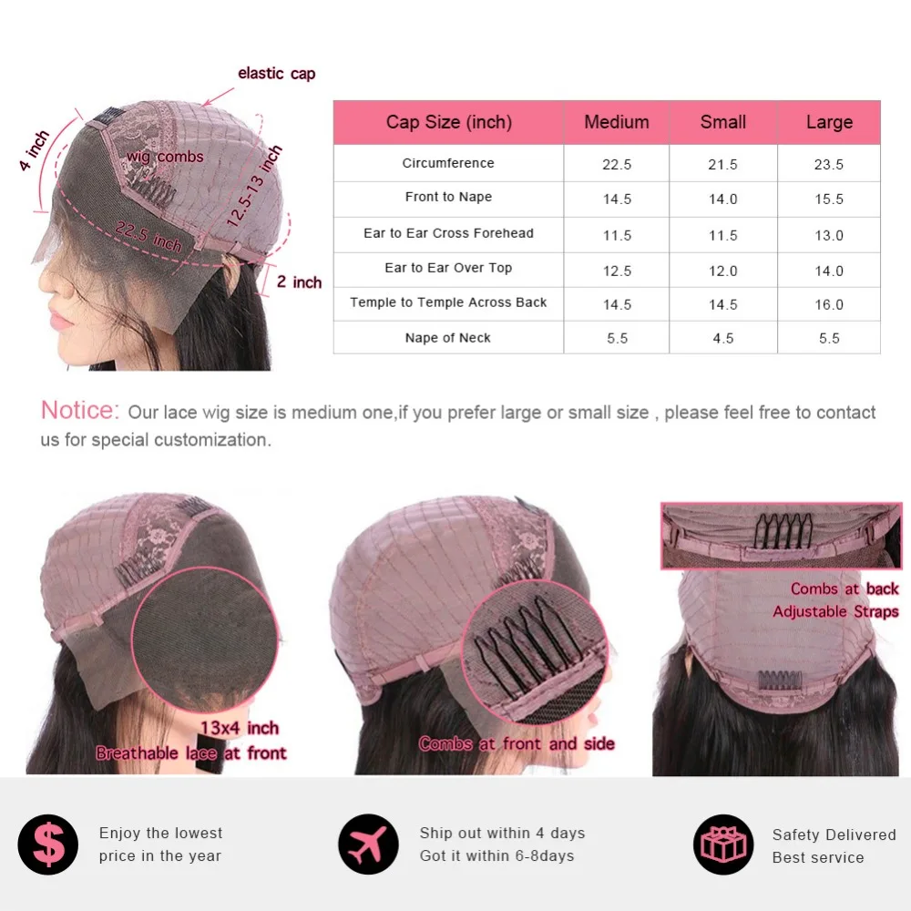 Материал: бразильские человеческие волосы Remy Длина: 10 "-16" в наличии Цвет: натуральный цвет, вы можете покрасить его Парик шнурка: 13x4 бесклеевой Синтетические волосы на кружеве парик Плотность волос: 130%, 150% Плотность Размер шапки: средний размер шапки Цвет кружева: прозрачное кружево Линия волос: предварительно выщипанная естественная линия волос