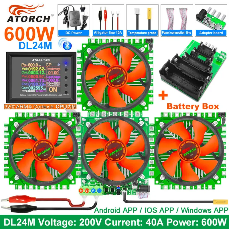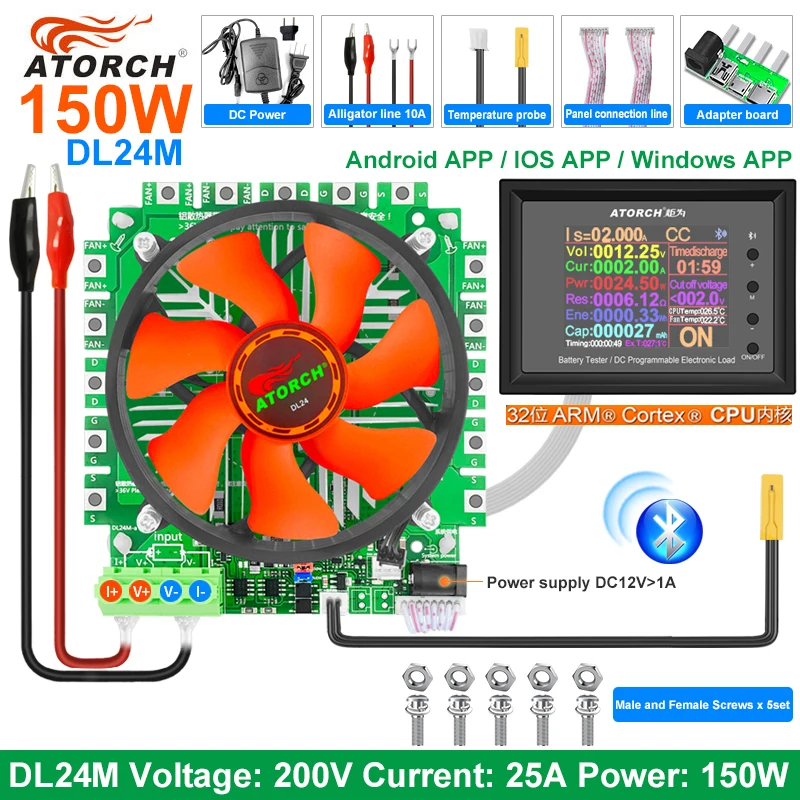1.DL24M -150 Вт цветной дисплей Bluetooth цифровой контроль кривая версия нагрузки Tesr x12. Источник питания DC12V 1A x13. Мужские и винты мама X5 наборы4. Датчик температуры x15. Красная и черная одиночная линия крокодил клип линия x16. Адаптер США в ЕС x1