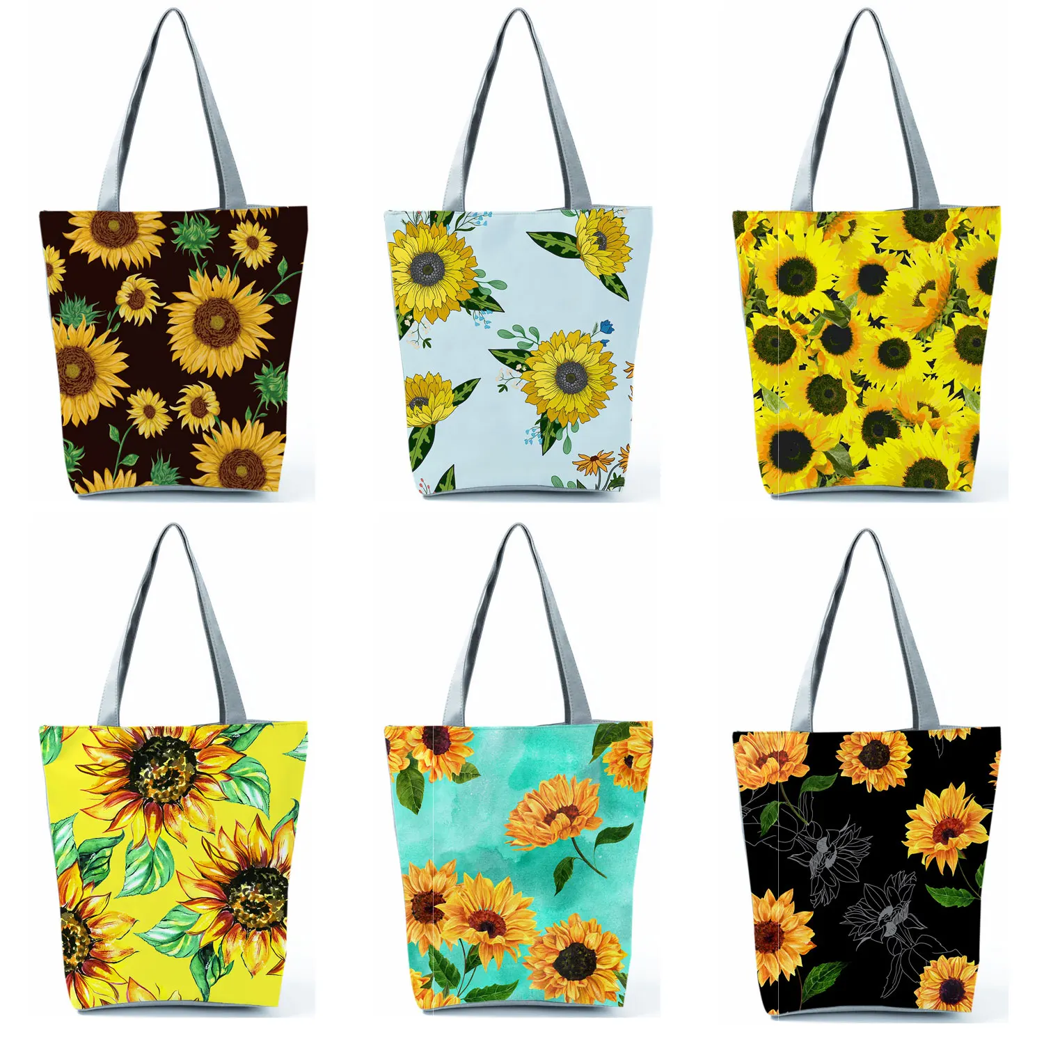 Черные сумки с принтом подсолнуха для женщин, простая Экологически чистая сумка через плечо с цветочным принтом, вместительная Портативная сумка для покупок