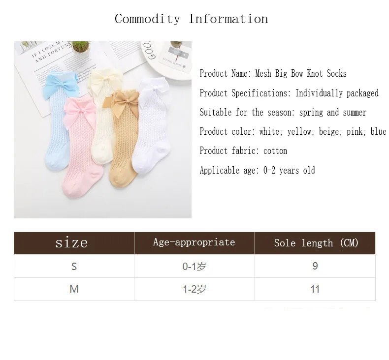 Размер: S: нижняя часть носков 0-1 года 9 см M: носки для детей 1-2 лет, длина: 11 см Особенности Детские сетчатые носки с большим бантом 100% новый и высококачественный Материал: смесь хлопка Один размер подходит для большинства Теплый и модный дизайн Цвет: белый/бежевый светильник бой/желтый/светильник-розовый
