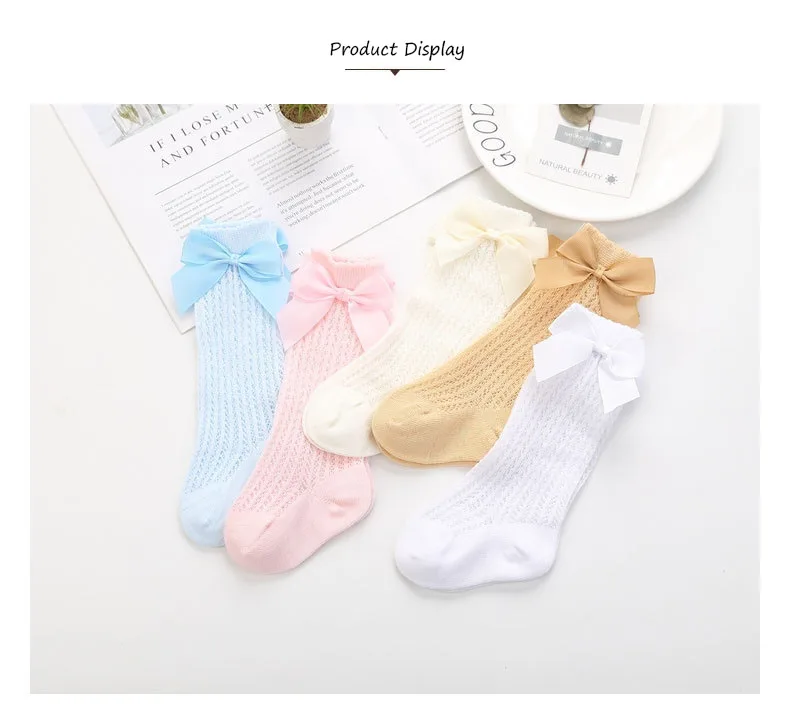 Летние носки для новорожденных девочек, сетчатые детские носки, мягкие хлопковые гольфы до колена с бантом для маленьких девочек, носки для новорожденных, детей