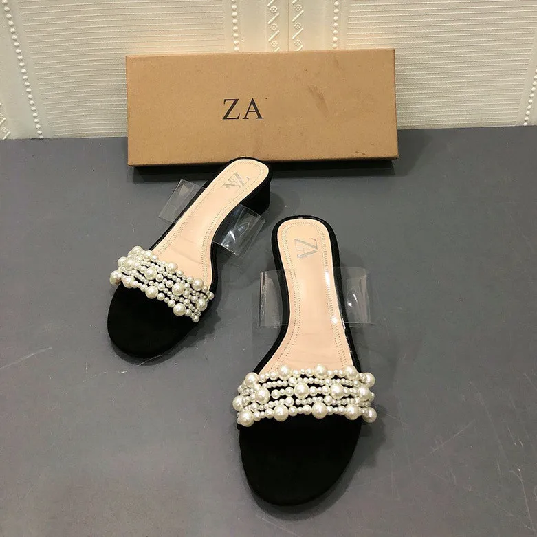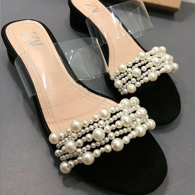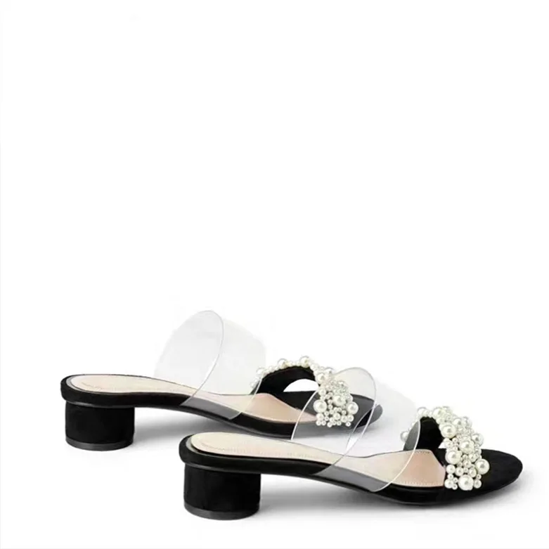 Женские сандалии с открытым носком и жемчугом, летние женские сандалии Claquette Femme, модные женские шлепанцы на высоком каблуке, черные шлепанцы