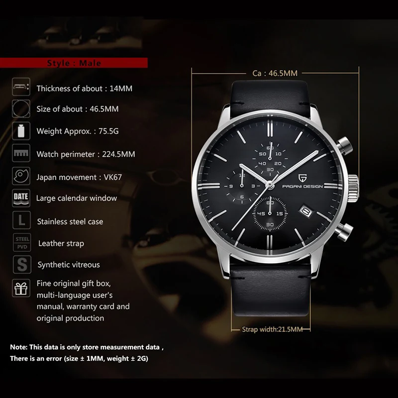 Фирменное наименование: дизайн PAGANIДлина ремешка: 22,45 смСтиль: Модный и повседневныйМеханизм: кварцевыйГлубина водонепроницаемости: 3 барТип застежки: ПряжкаМатериал корпуса: нержавеющая стальЧехол Толщина: 14 ммМатериал циферблата: HardlexТип изделия: кварцевые наручные часыМатериал коробочек и чехлов: бумагаМатериал ремешка: нержавеющая стальДиаметр циферблата: 43 ммГруппа Ширина: 21,5 ммОсобенность: ХронографОсобенность: плаваниеПоставка фабрики: Поддержка Прямая поставкаЦвет: стальной черный, белыйReloj hombre : montre homme