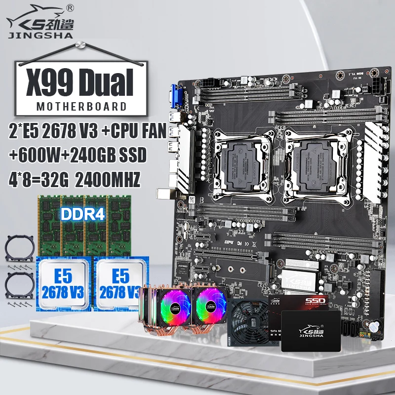 Примечание:Комплект материнской платы, включая,1 шт. X99dual материнская плата и 2 шт. E5 2678V3,4 шт. 8 Гб 2400 МГц ECC REG RAM,2 шт. вентилятор процессора, 240 ГБ SSD