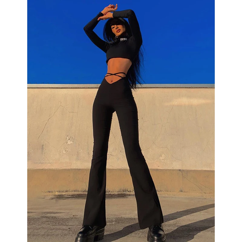Женские брюки-клеш ADEAST Cyber Y2k, черные, со шнуровкой и V-образным вырезом, с низкой посадкой, в стиле Харадзюку