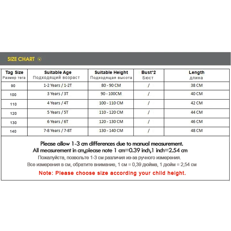 Пожалуйста, выберите одежду в соответствии с ростом ваших детей. Если ваш ребенок пухленький, вы можете выбрать один размер побольше.О доставке:Ваши посылки будут отправлены в течение 24 часов и 7-12 дней для прибытия в Северную Америку, 10-25 дней для прибытия в Европу и 20-40 дней для прибытия в Южную Америку.Оптовая цена:Вы можете получить скидку 5% при покупке более 10 штук; Если сумма покупки превышает количество, пожалуйста, свяжитесь с нами для консультации.Доставка по DHL, EMS:Мы отправим посылкуПо DHL или EMS, Если оплата заказа превышает150 долларов.