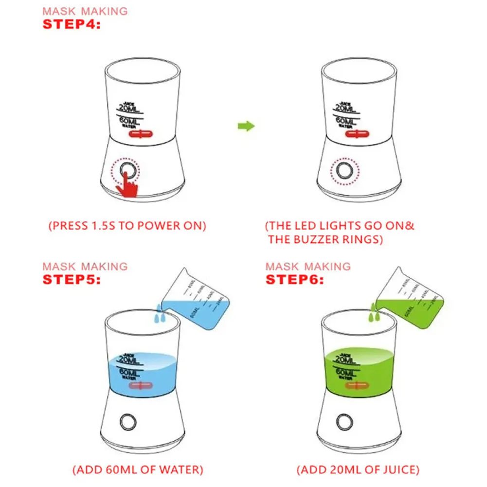 Наша машина для покрытия лица позволяет вам делать различные виды натуральных чехлов для лица в зависимости от вашей кожи. Низкий уровень шума, одна кнопка для работы, простота в эксплуатации. Вы можете сделать свой собственный фруктовый или Овощной чехол для лица дома и добавить его в спа-день, чтобы обеспечить лучший уход за кожей, укрепляющий эффект и эластичный эффект восстановления. Особенности Машина для нанесения крышек для фруктов и овощей -Цвет: белый. -Материал: АБС-пластик. -Размеры: 11,5 х 7 см/4,53x2,76 дюймов. Источник питания: 2 аккумулятора AAA (не входят в комплект) Как использовать: 1: после установки двух батарей AAA Включите устройство 2: Добавьте 60 мл воды выше 75 градусов Цельсия 3: Добавьте 20 мл сока или добавьте молоко, красное вино, овощной сок и т. д. (в соответствии с вашими потребностями) 4: Добавьте зерно коллагена 5: запуск машины 6: устройство имеет функцию автоматического синхронизации, 3-4 минуты после его включения, оно автоматически прекратит работу и отправит музыку, чтобы напомнить вам, что крышка сделана 7: Налейте подготовленную жидкость в лоток для крышки или в форму для покрытия глаз 8: после охлаждения, вы можете наслаждаться крышкой Упаковочный лист1 * машина для покрытия лица фруктовым овощом 1 * лицевая крышка 16 * активный пептид коллагена 1 * Руководство пользователя 1 * скребок для крышки лица 2 пары * Форма для крышки глаз