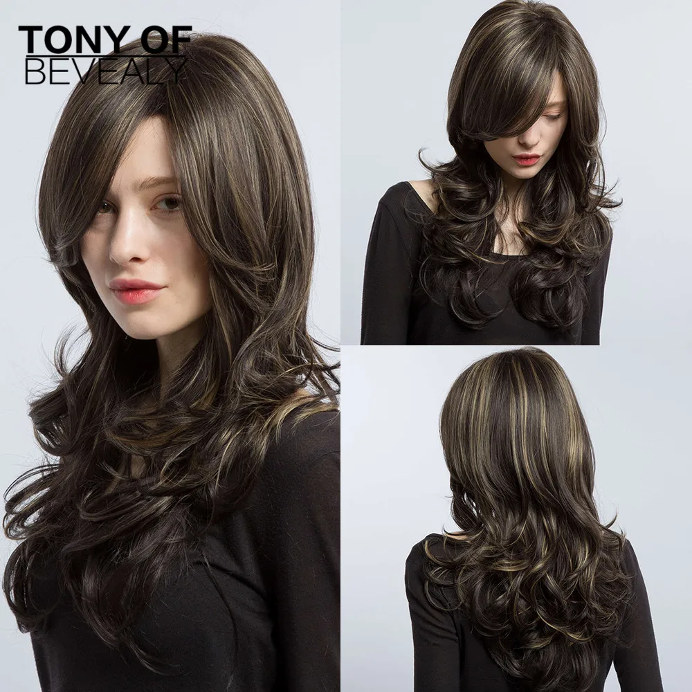 Длинные волнистые черные с блондинкой хайтлайт синтетические парики для женщин с челкой косплей натуральные парики термостойкие волосы парики