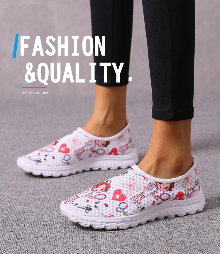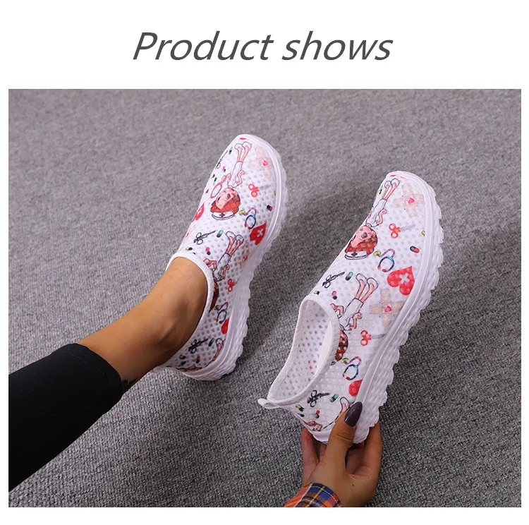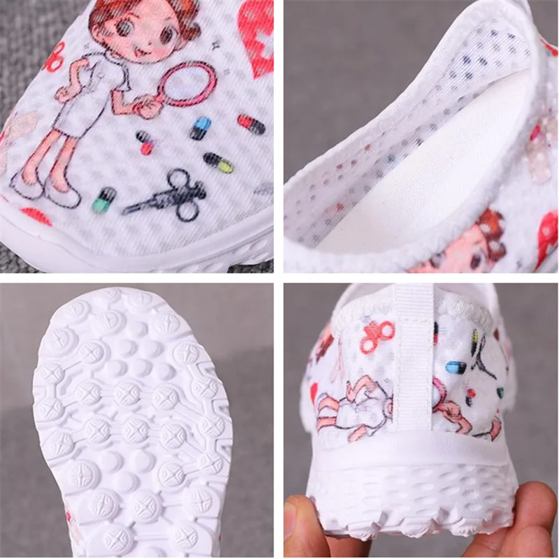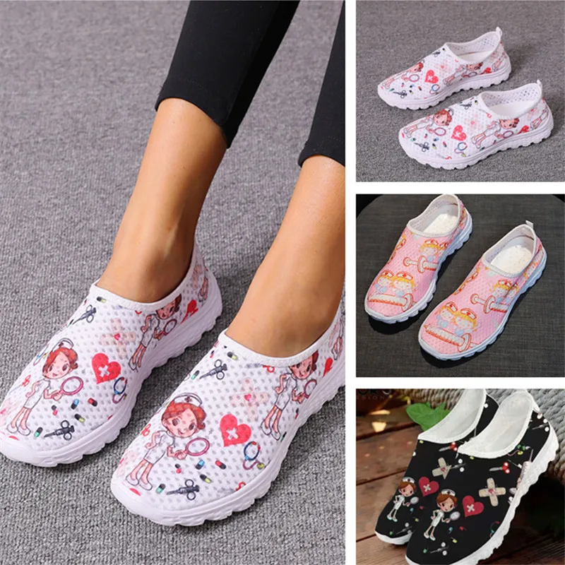 Сетчатая легкая дышащая мягкая женская повседневная обувь мультфильм медсестра печати без шнуровки шлепанцы без застежки на плоской подошве; Ботинки размера плюс с закрытым носком; Спортивная обувь