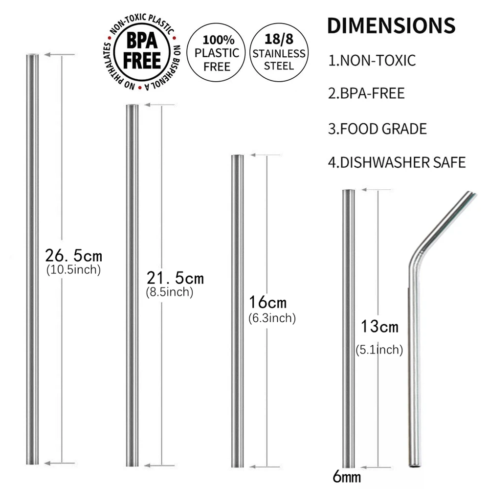 3. 4 размера: Длина: 13 см, каблук 16 см, 21,5 см, 26,5 см; Наружный Диаметр: 6 мм (многоразовая Питьевая соломка) подходит для различных размеров стаканы и чашки для воды; идеально подходит для ваших напитков, соков, лимонада, кофе, коктейлей, чая со льдом, капучино и т. д.