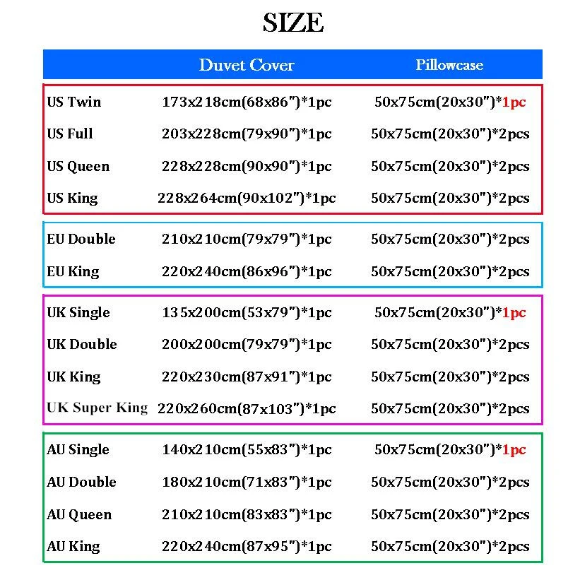 6. Посылка: свяжитесь с нами для двухспальной кровати размер Single, Великобритания/AU односпальная 2 шт./компл. (1x Пододеяльник, 1x наволочка), Другое размеры 3 шт./компл. (1x Пододеяльник, 2x наволочки).