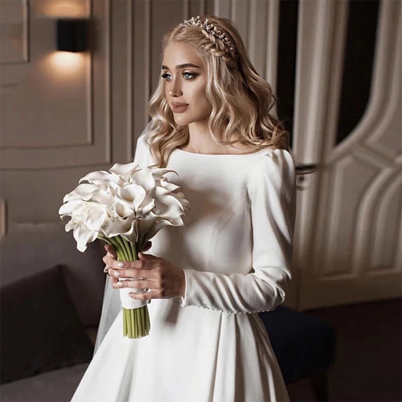 Атласное с вырезом лодочкой свадебное платье с длинным рукавом пляжное уличное платье с пуговицами и открытой спиной на заказ 2021 свадебное платье со шлейфом больших размеров