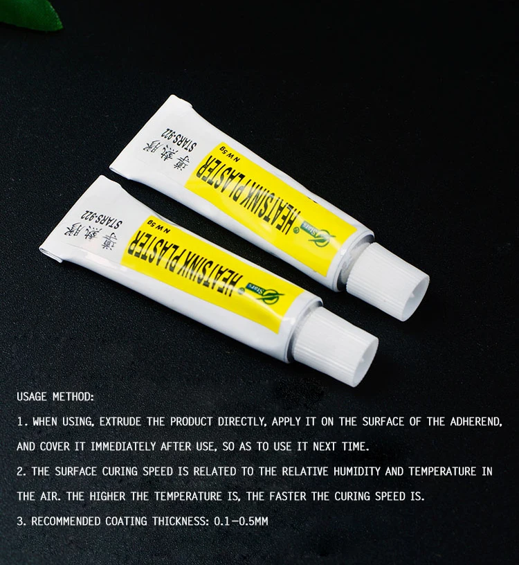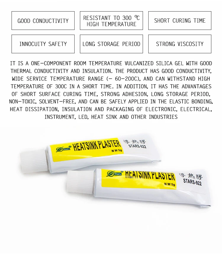 Это один компонент комнатной температуры вулканизированный силикагель с хорошей теплопроводностью и изоляцией. Продукт имеет хорошую теплопроводность, широкий диапазон температур (-60-200 °C) и кратковременное сопротивление до 300 °C. Кроме того, он имеет короткое время отверждения поверхности, сильное сцепление, длительный срок годности, нетоксичный, без растворителя, и может быть безопасно применен в эластичном склеивании, рассеивании тепла, изоляция и упаковка электроники, электроприборов, инструментов и других отраслей промышленности.
