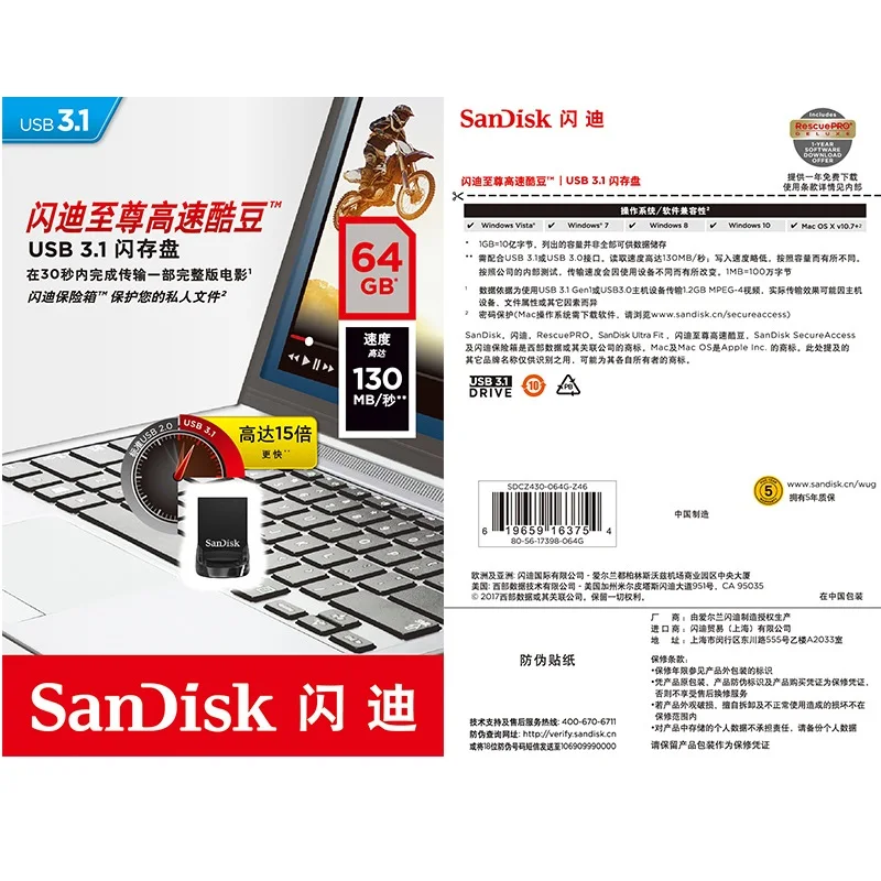 Мини-флеш-накопитель USB 100% SanDisk, USB-накопитель CZ430 USB3.1 s 64 Гб 16 Гб 130 МБс. 32 Гб 128 ГБ 256 ГБ для планшета