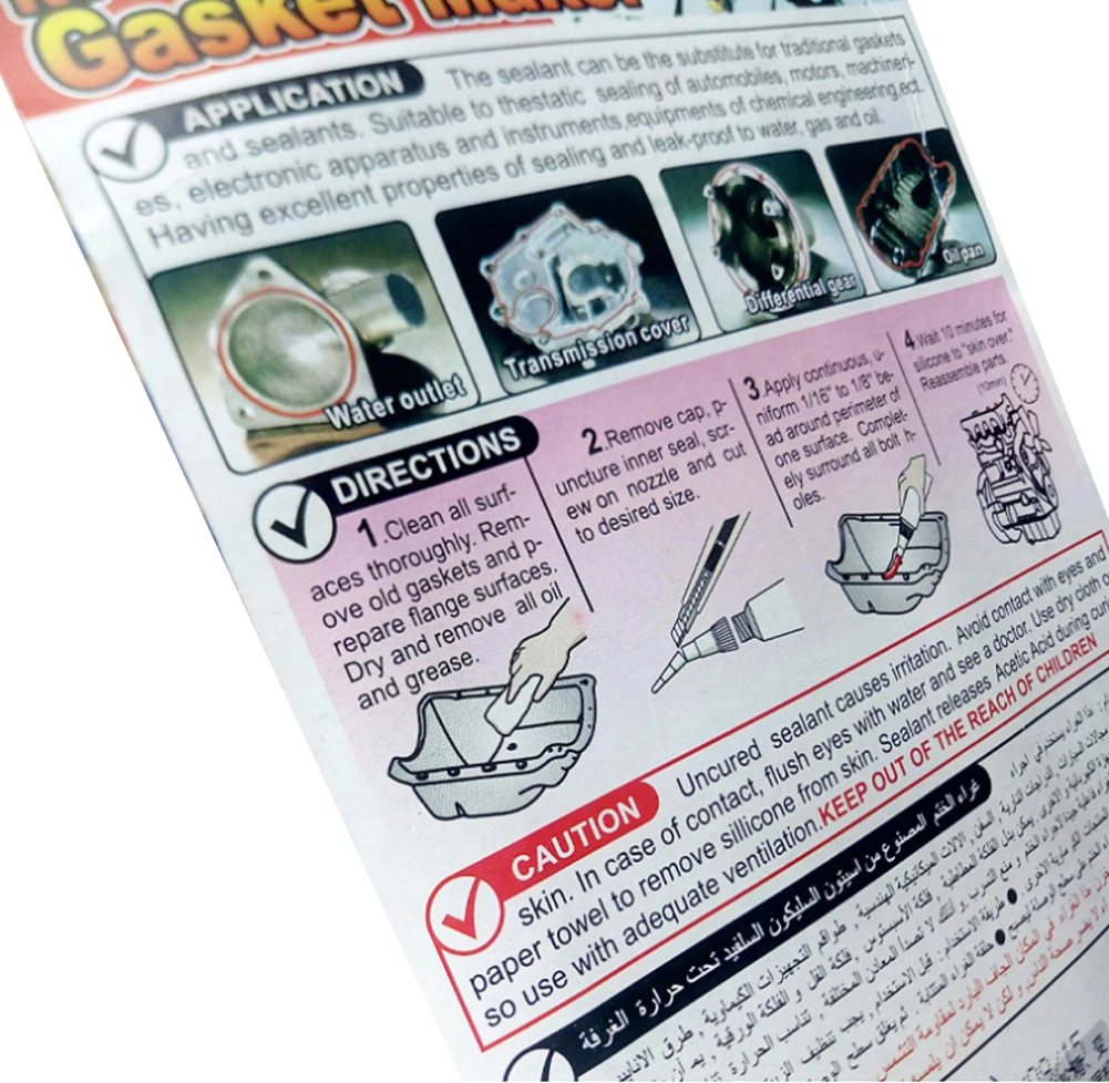 Бесплатная прокладка уплотнитель Mi Bao красный клей 85 г автомобильное механическое уплотнение герметичное электронное уплотнение клей Силиконовое уплотнениеОписание товара:Высокотемпературный герметик: красный/черныйИспользование: этот продукт в основном используется для статической герметизации механических деталей, таких как блоки двигателя, коробки передач, коробки передач, масляные сковороды и оси различных автомобильных и мотоциклетных двигателей.Можно наносить на плоское уплотнение инженерной техники, станков, электроники, химического оборудования, трубопроводов и инструментов.Характеристики: Этот продукт представляет собой силиконовый герметик для расчесывания комнатной температуры с быстрой скоростью отверждения и быстрым образованием подушек.Эффективно предотвращает просачивание, капание, капание и утечку различных соединительных поверхностей. Термостойкость (-50 ~ 343 градусов), сопротивление давлению (10 МПа), маслостойкость, вода, пар и химические вещества, не подвергают коррозии различные металлы.Способ применения: Перед использованием Очистите поверхность стыка от масла, воды, ржавчины и пыли. Равномерно распределите изделие по Поверхности стыка, образуя непрерывное резиновое кольцо. Закройте поверхность соединения и закрепите соединение.Меры предосторожности:1. Хранить в сухом прохладном месте, чтобы избежать жары на солнце.2. После использования плотно закройте уплотнение, чтобы избежать испарения и сухости.3. Этот продукт безвреден для организма человека. Не позволяйте детям прикасаться к нему, чтобы избежать входа.