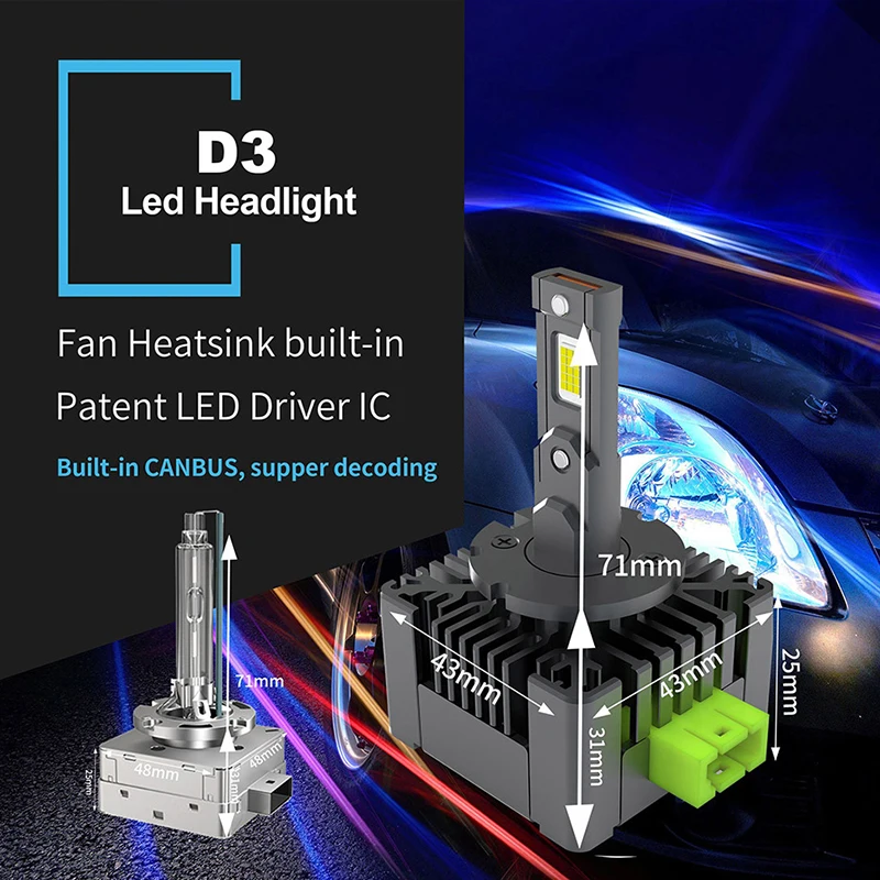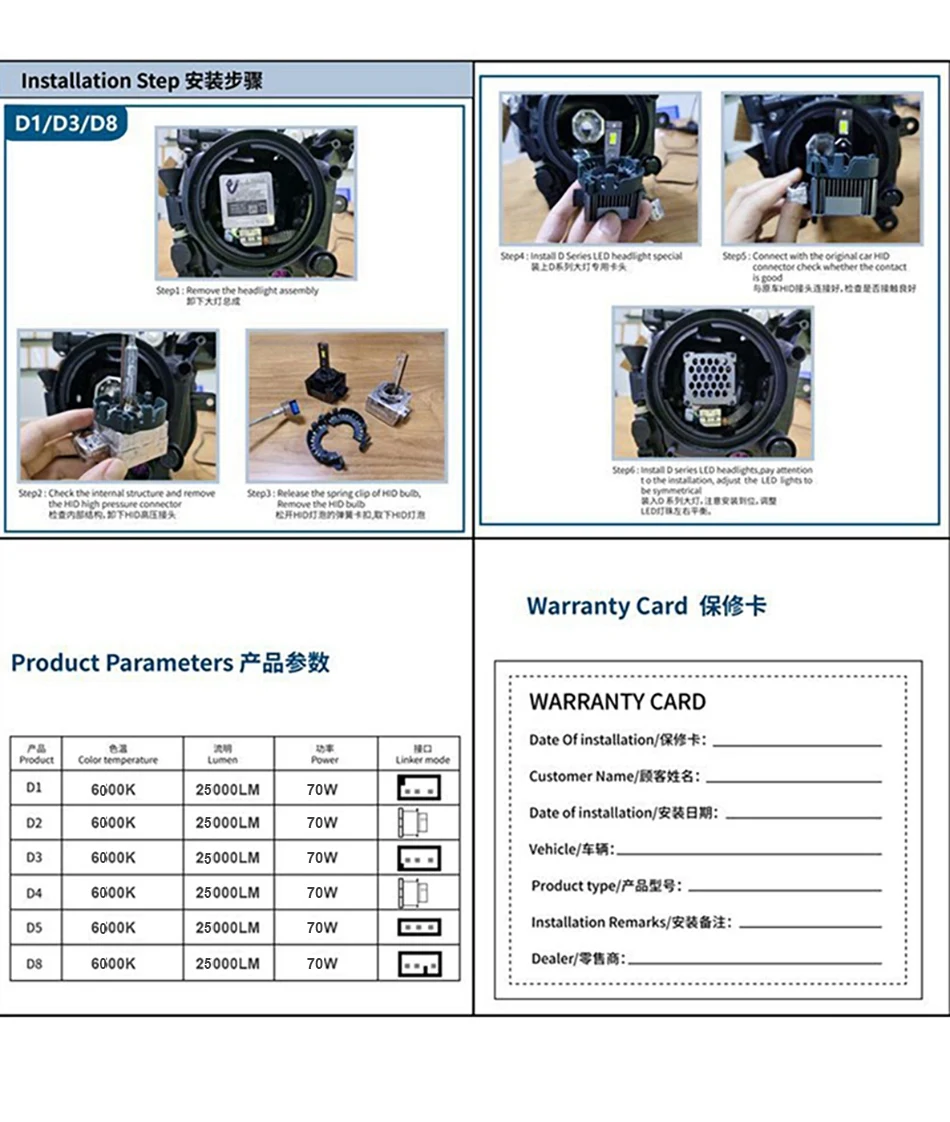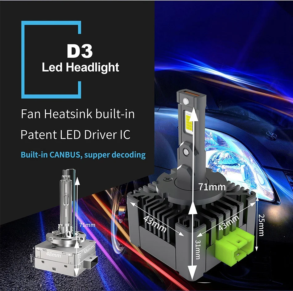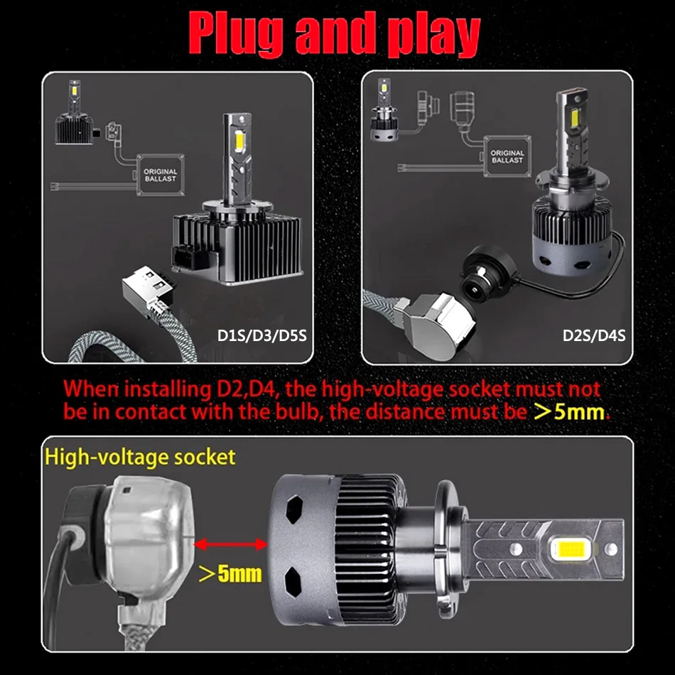 В стоимость входит: 1 пара светодиодный ламп (2 шт.)Информация о продукте:Светодиодный чип: чипы CSP.Люмены: 20000LM/пара.Цветовая температура: 6000K белый.Рабочее напряжение: 9-16 В постоянного тока.Мощность: 45 Вт ± 5 Вт/лампа.Установка: универсальная. Подключи и работай.Гарантия: 3 года.Преимущества/Особенности:1,10 минут неразрушающая установка. Этот светодиодный фар головного света может быть instal светодиодный непосредственно к транспортным средствам, что с оригинальным D1S D1R D2S D3S D3R ксеноновая лампа, не нужно снимать оригинальный балласт. Нет необходимости вносить какие-либо изменения в исходные провода/соединение.2. Высокая яркость. Этот светодиодный светильник высокой яркости составляет до 10000 люмен на лампу и на 300% ярче, чем Оригинальная Автомобильная ксеноновая лампочка.3. Длительный срок службы. Долгий срок службы 80000 часов, обычно это в 10 раз больше, чем у обычной лампы HID.4. 0,01 S мгновенно яркий, без задержек, увидеть состояние дороги на ранней стадии.