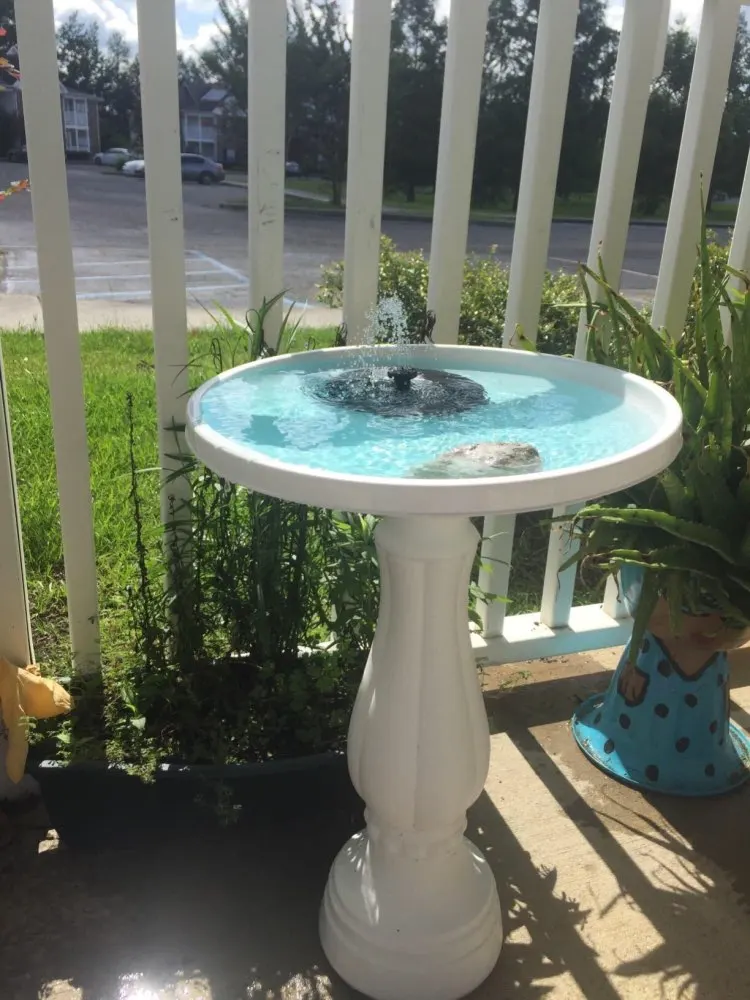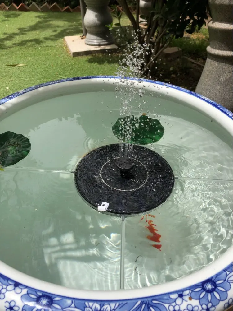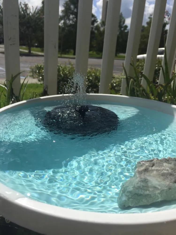 Маленький Солнечный фонтан. Отличный источник, помещенный в бассейн, вода будет накачана в течение нескольких минут, мотор zumbira sun и различные насадки pulverizarao воды и различной высоты. Принцип работы отличный. Птица, которая все еще привлекла, не осмелилась приблизиться к фотографии из-за боязни, но фотографии, сделанные далеко, были немного размыты. В целом очень хорошо, обслуживание продавца также отличное, рекомендую вам