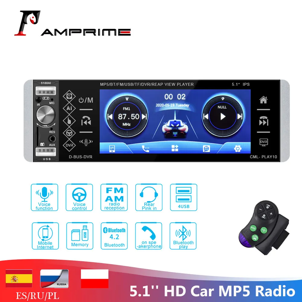 Автомобильный mp5-радиоприемник AMPrime 1 Din, 5,1 дюйма, поддержка сабвуфера, подключение FM, AUX, USB, DVR, Mirror Link, рулевое колесо с камерой заднего вида