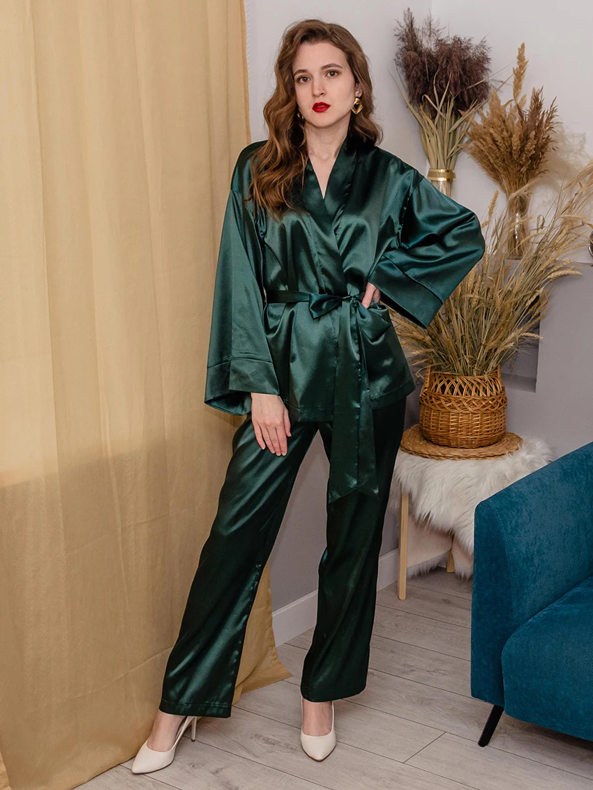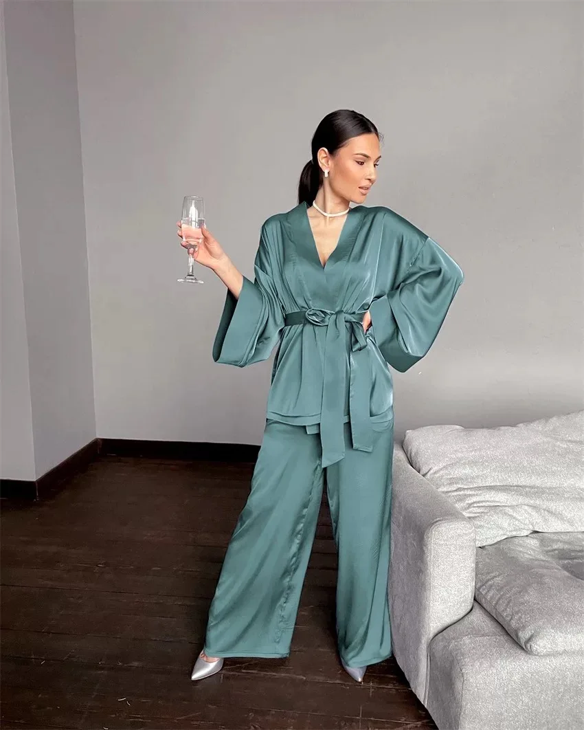 Элегантные розовые женские халаты с поясом, комплект из 2 предметов, топы для сна на запястье, атласные брюки, свободная Пижама, повседневная одежда для сна, женские домашние костюмы