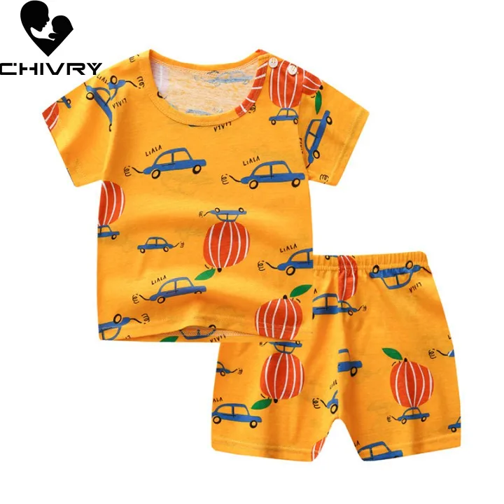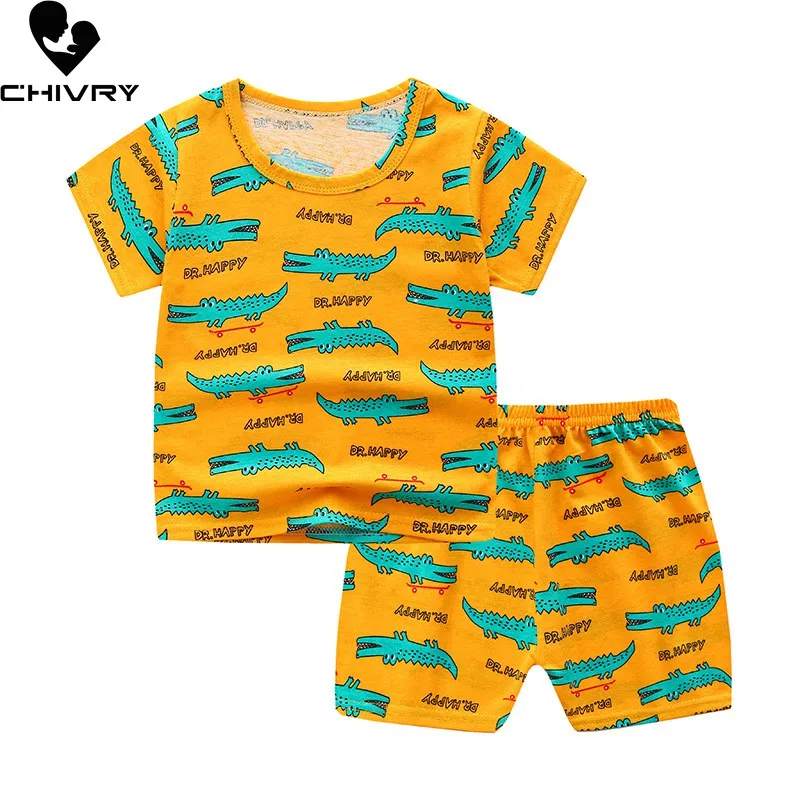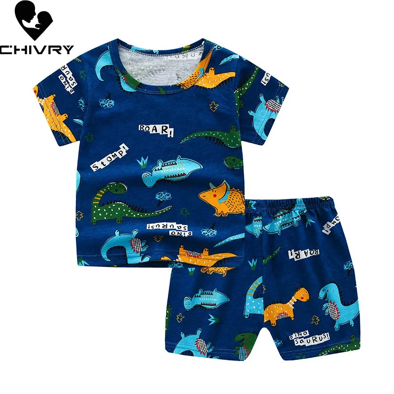 Пижамные комплекты для мальчиков и девочек, летняя Милая футболка с коротким рукавом и круглым вырезом с мультипликационным принтом, топы и шорты, 2021