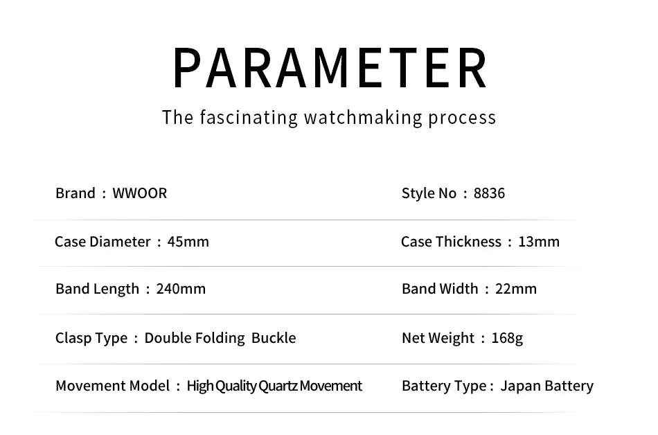 Посылка-1 часы WWOOR-1 подарочная коробка WWOOR-1 х чистая ткань-1 x регулятор ремешка для часов (вы можете отрегулировать длину ремешка самостоятельно, не нужно ходить в магазин часов)---- Дорогие друзья, мы являемся производителем, если вам нужна цельная доставка, Перепродажа, оптовая покупка, пожалуйста, свяжитесь с нами.