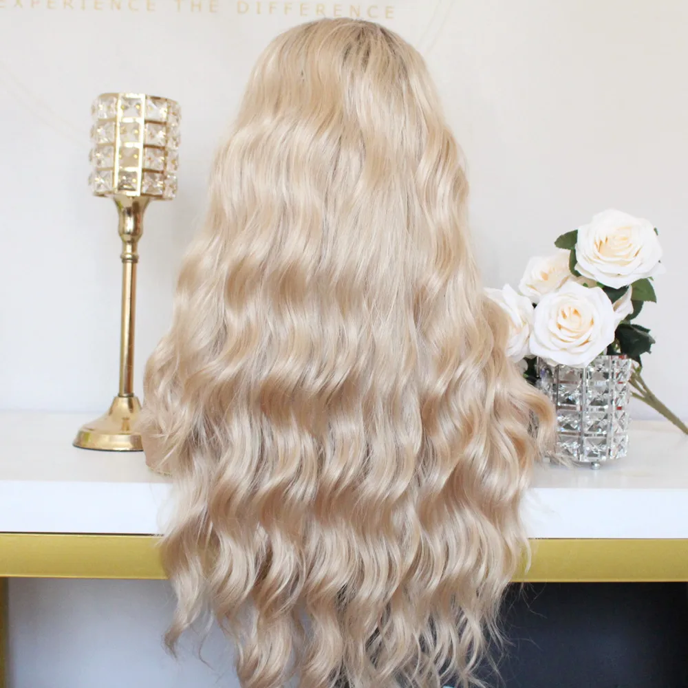 Парик с эффектом омбре блонд, натуральные волны, синтетические кружевные парики для женщин, 22 дюйма, длинные темные корни, блонд, средняя часть, термостойкие парики