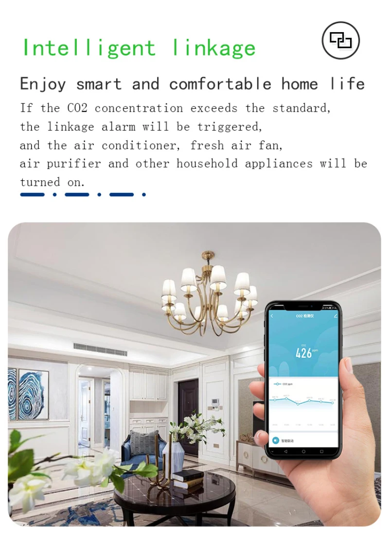 Домашняя среда находится под контролем в режиме реального времени, просмотр концентрации дома C02 через умное приложение Tuya