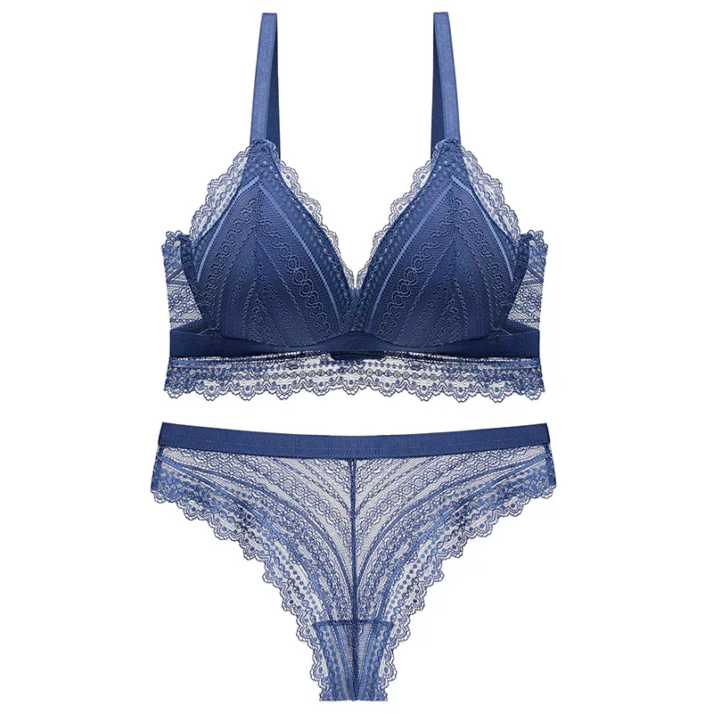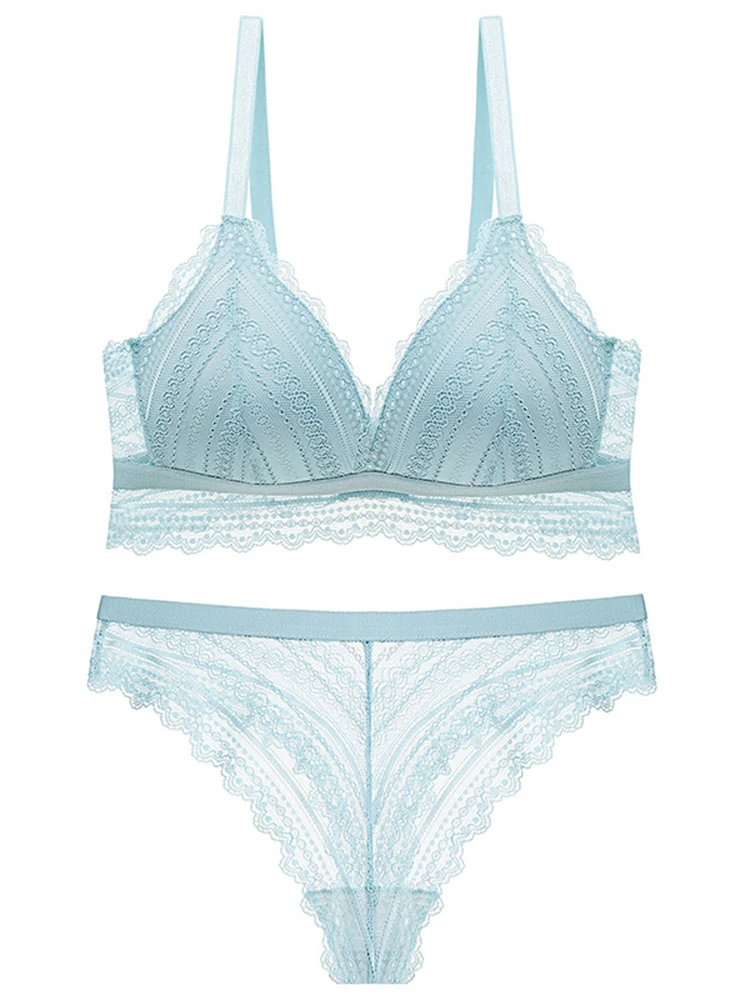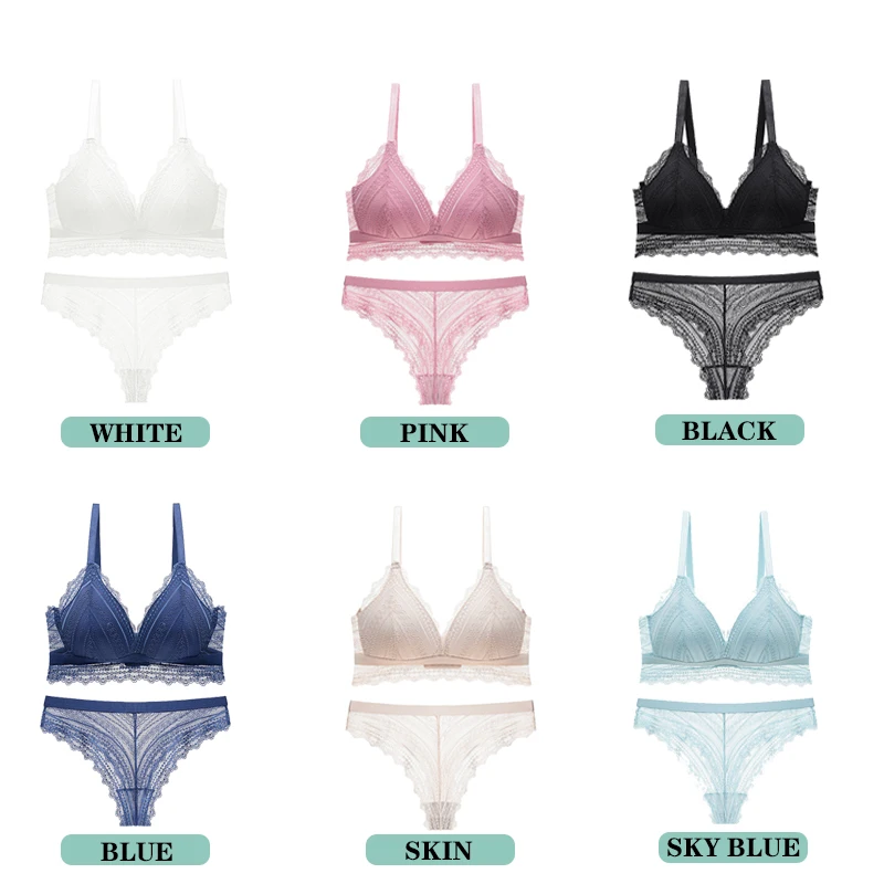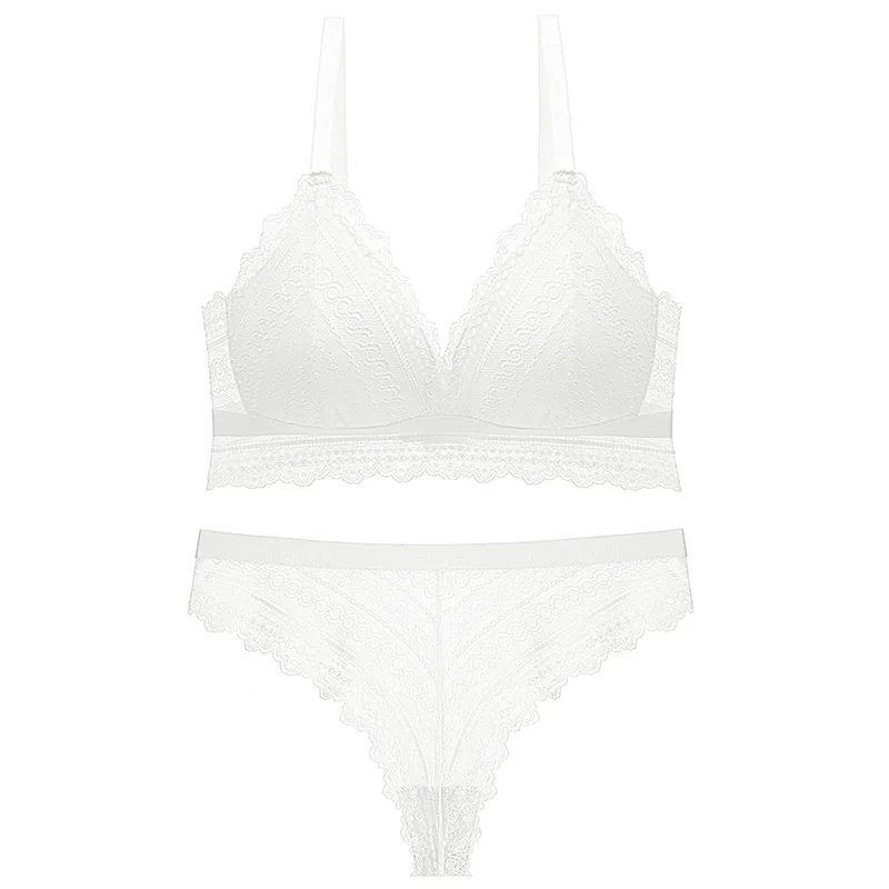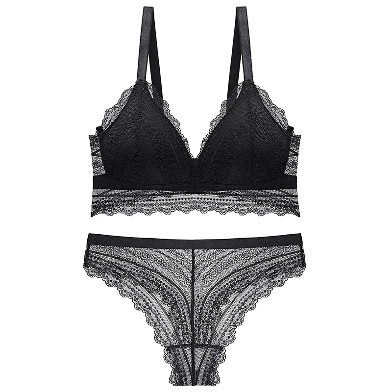 Ультратонкие наборы бюстгальтер + трусы, комплект кружевного нижнего белья, сексуальный Высококачественный удобный и дышащий беспроводной бюстгальтер треугольный глубокий v-образный вырез