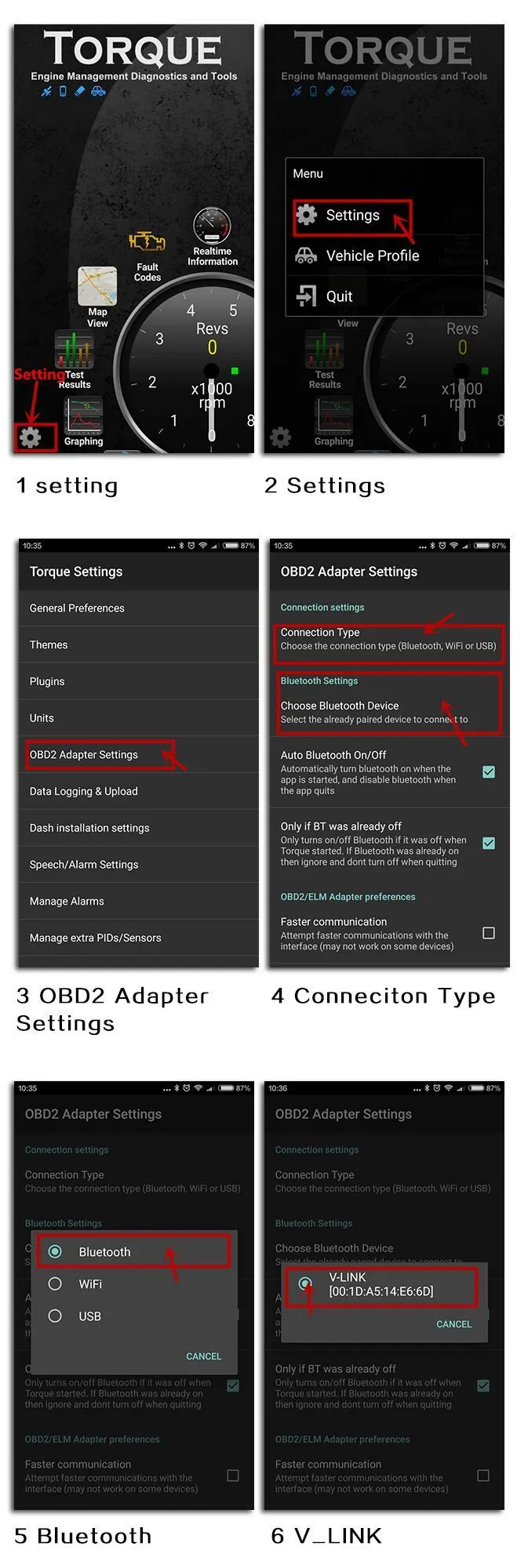 4. Откройте программное обеспечение TORQUE, перейдите в «состояние адаптера»-«настройки» сверху справа, выберите «настройки Адаптера OBD2»; Выберите «Настройки подключения» как «Bluetooth»; выберите «настройки Bluetooth» как «OBDII»; Выйдите из приложения TORQUE перезагрузите приложение TORQUE, Вы увидите, как зеленый светильник мигает, и подождите некоторое время, пока он будет развивать связь.