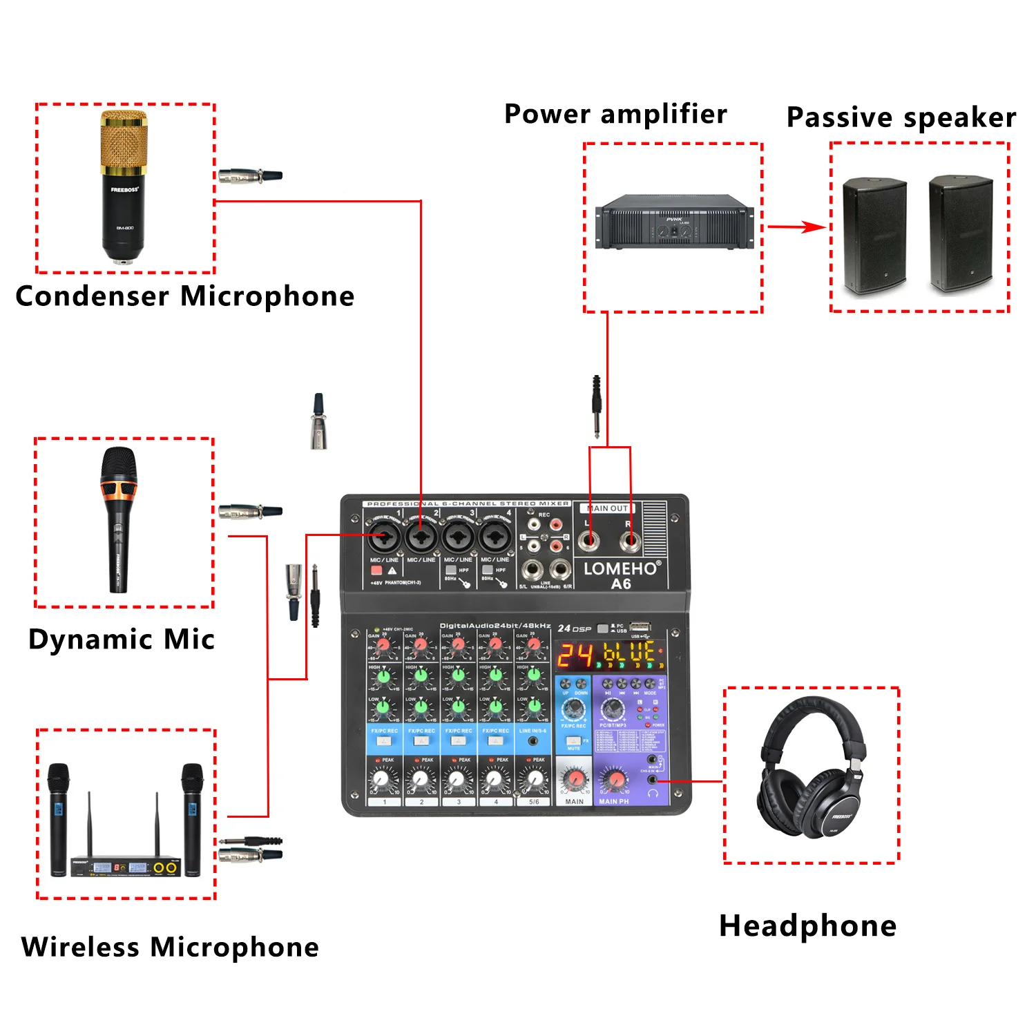 6-канальный миксер LOMEHO A6 не поставляется с проводкой ПК, он не подключается к ПК. Bluetooth не работает. Я не рекомендую покупать у этого продавца.