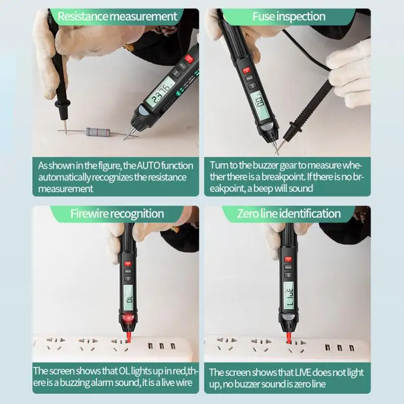 Универсальный перьевой мультиметр: Этот мультиметр отличается тестированием сопротивления/емкости/диода/частоты/температуры, непрерывности, нулевой линии и бесконтактного определения напряжения и т. д.