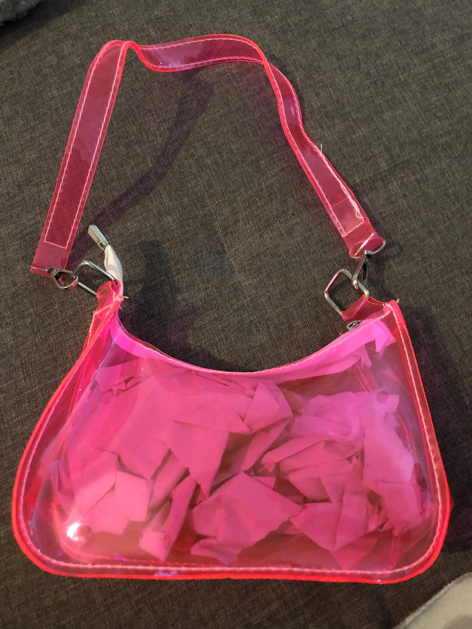 あいふぉんとさいふとえあぽっずがちょうどはいるさいずってかんじ。やすっぽいけどふつうにかわいい。なつにつかえる!!